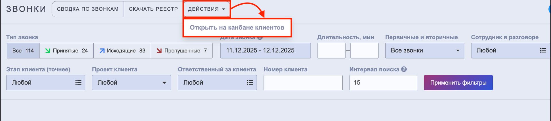 В настоящее время доступна опция "Открыть на канбане клиентов", которая отображает выбранные (отфильтрованные) звонки в виде соответствующих карточек на канбане клиентов. Это даёт возможность сразу увидеть, на каком этапе находится каждый клиент из выборки, и перейти к дальнейшей работе с ними.