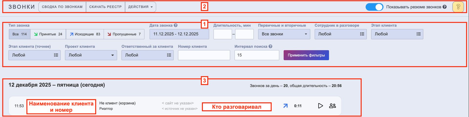 ПЕРЕКЛЮЧАТЕЛЬ "Показывать резюме звонков" — если в вашей организации подключена интеграция с системой речевой аналитики и для конкретного звонка сформировано автоматическое резюме, оно будет отображаться под записью разговора при включённом переключателе.