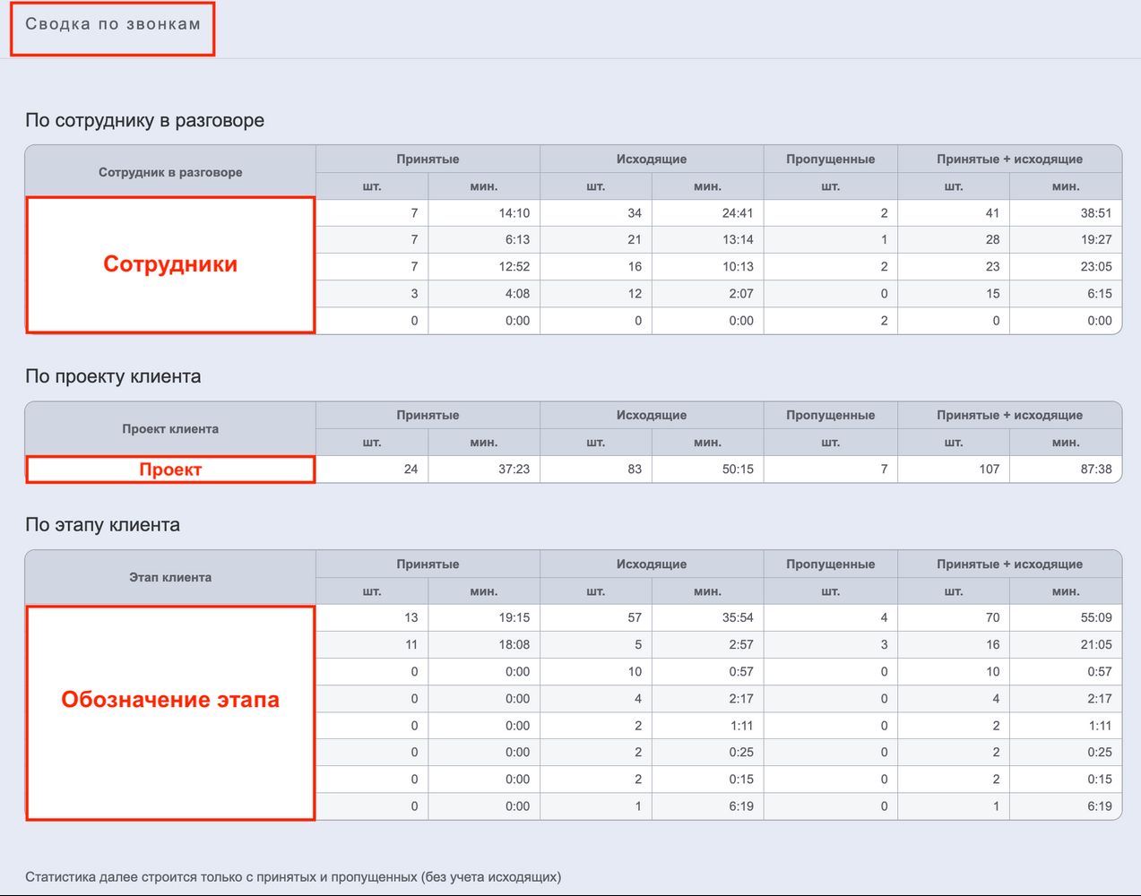 СВОДКА ПО ЗВОНКАМ — это аналитический отчёт, который обобщает и структурирует телефонную активность команды по нескольким ключевым срезам. Он предназначен для руководителей и менеджеров, чтобы оценивать нагрузку, эффективность и распределение звонков.