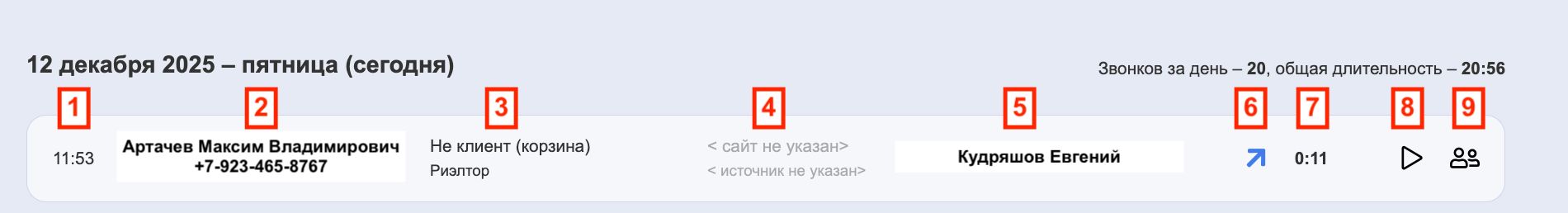 Все звонки отображаются в виде структурированной информации, распределённой по следующим параметрам: