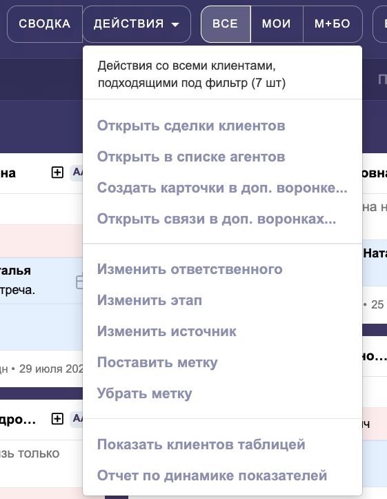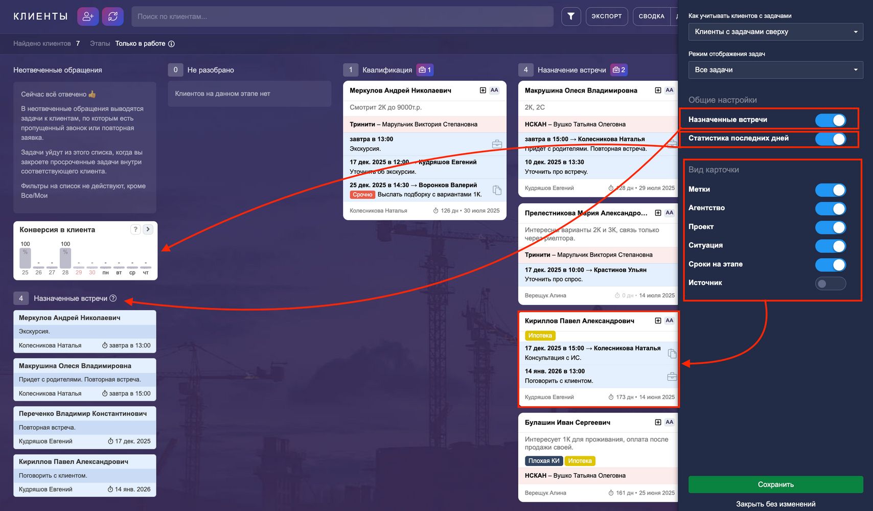 Мы уже рассмотрели основную структуру работы с клиентами с помощью канбан/воронки. Теперь давайте рассмотрим дополнительные интересные и полезные возможности в окне канбана: