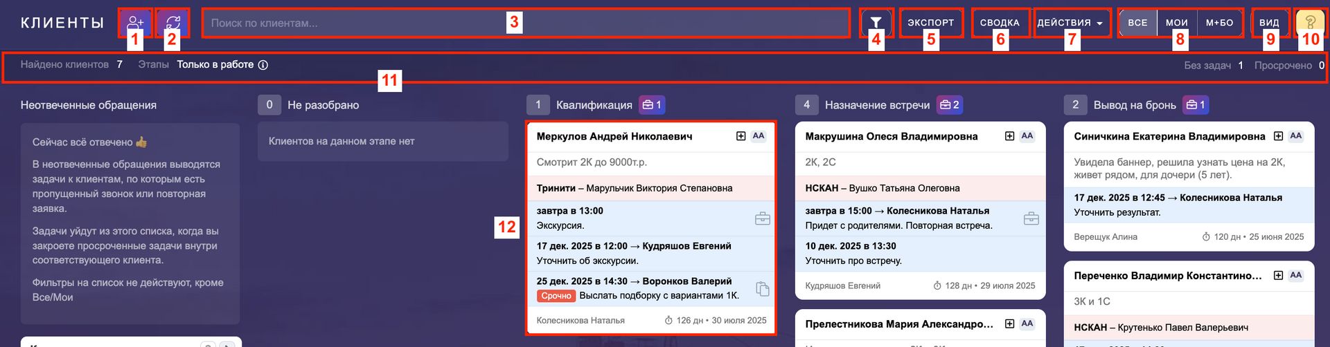 Для быстрого переключения между всеми и своими клиентами на канбане клиентов есть кнопка фильтрации. В один клик вы можете переключаться между своими и всеми доступными вам клиентами.