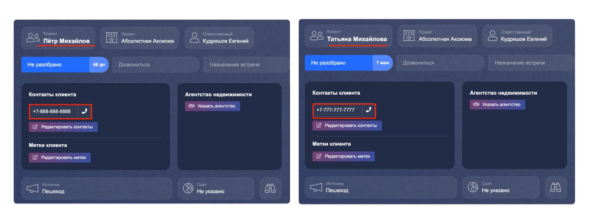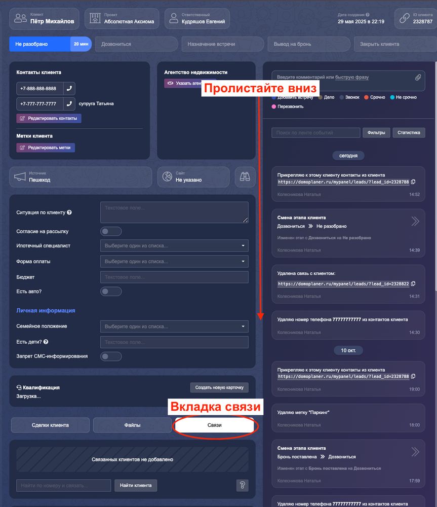 Клиент позвонил с другого номера и создалась еще одна карточка? Или два супруга будут участниками одной сделки, но сейчас заведены в систему как отдельные клиенты? В подобных случаях две карточки клиента можно объединить в одну.