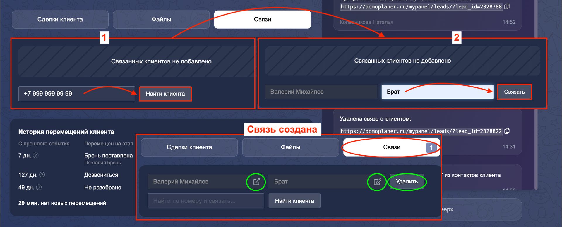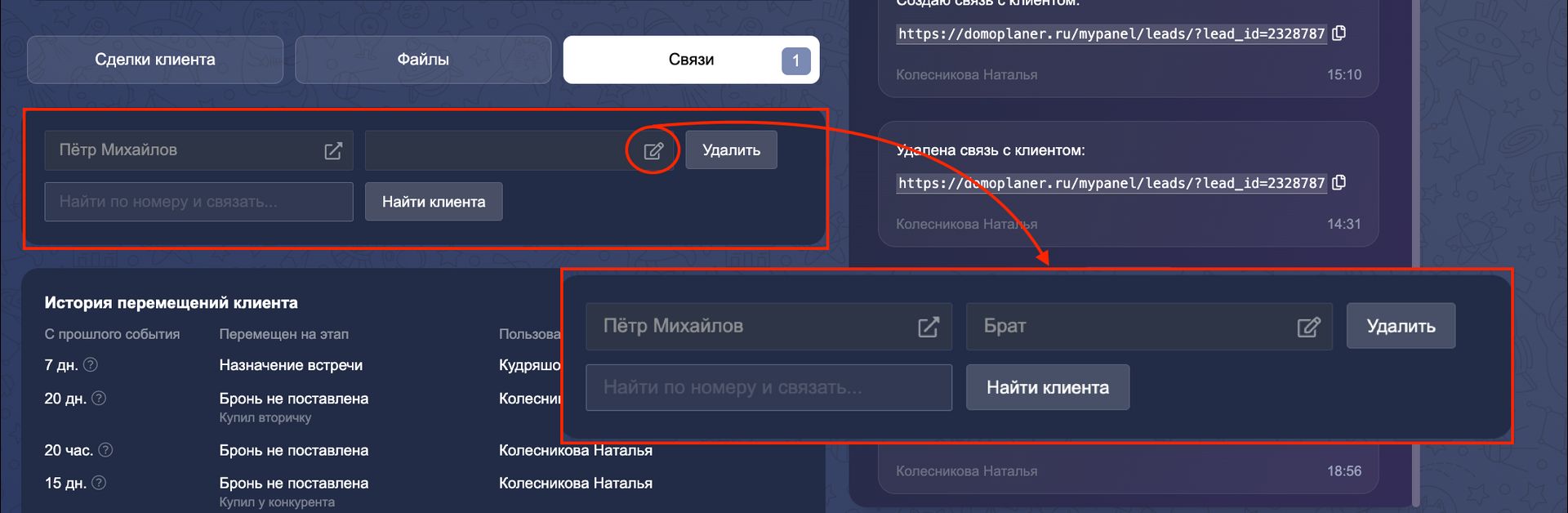 После создания появится связь. В ней можно выполнить следующее: перейти в карточку связанного клиента, редактировать комментарий, удалить связь.