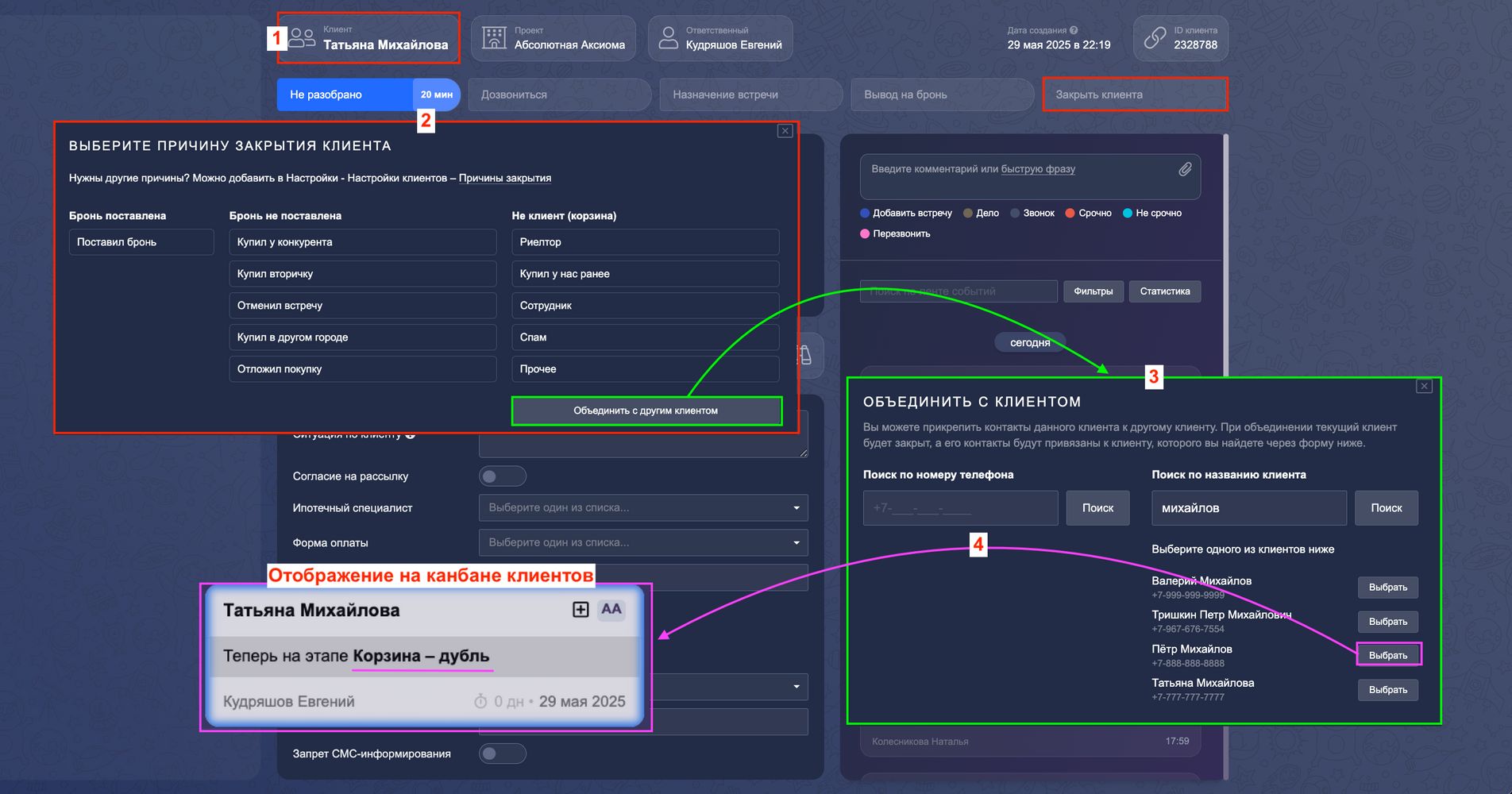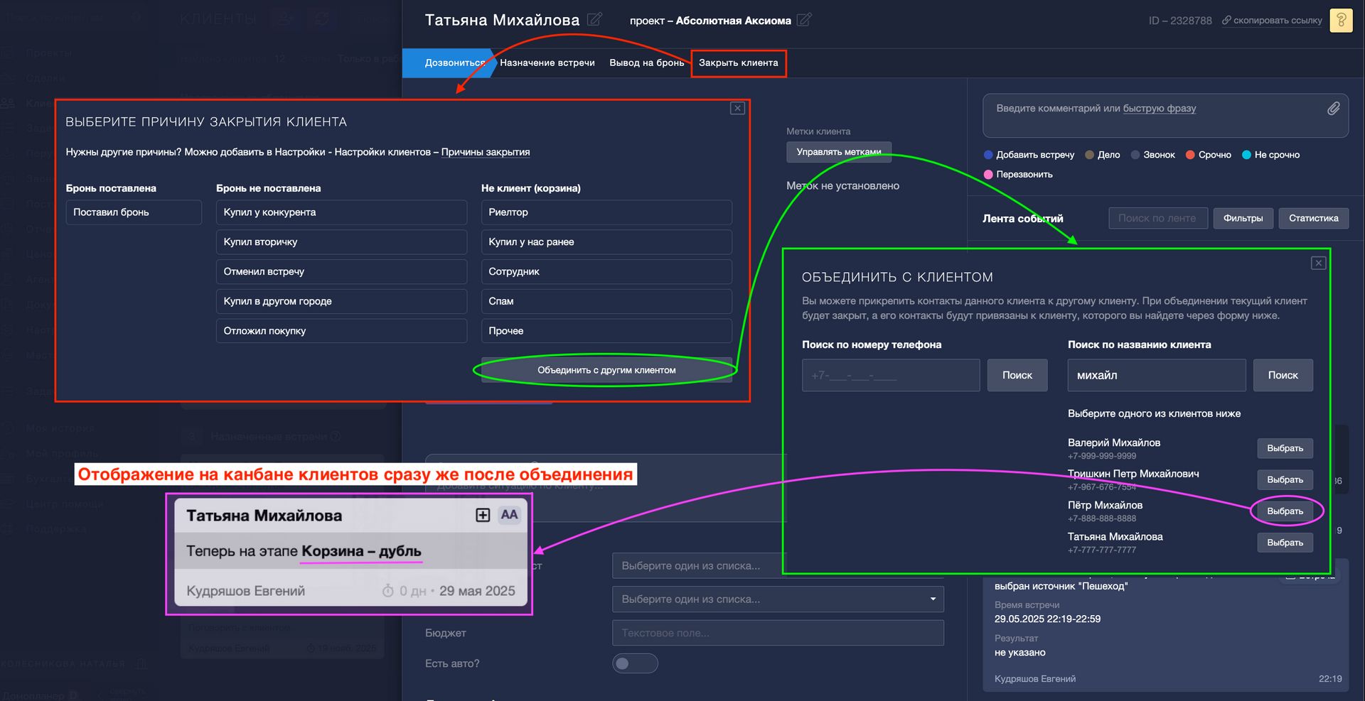 2. Выбираем этап "Закрыть клиента" — кнопка "Объединить с другим клиентом".