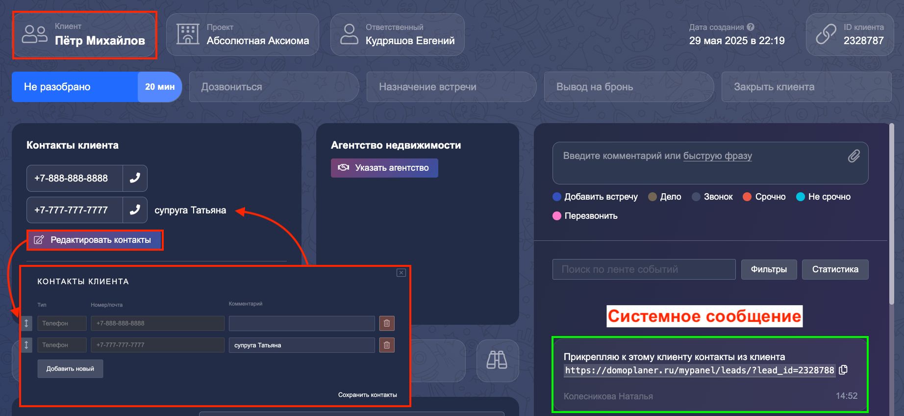 А также в карточке Петра появилось системное сообщение об объединении с ссылкой на поглощенную карточку.