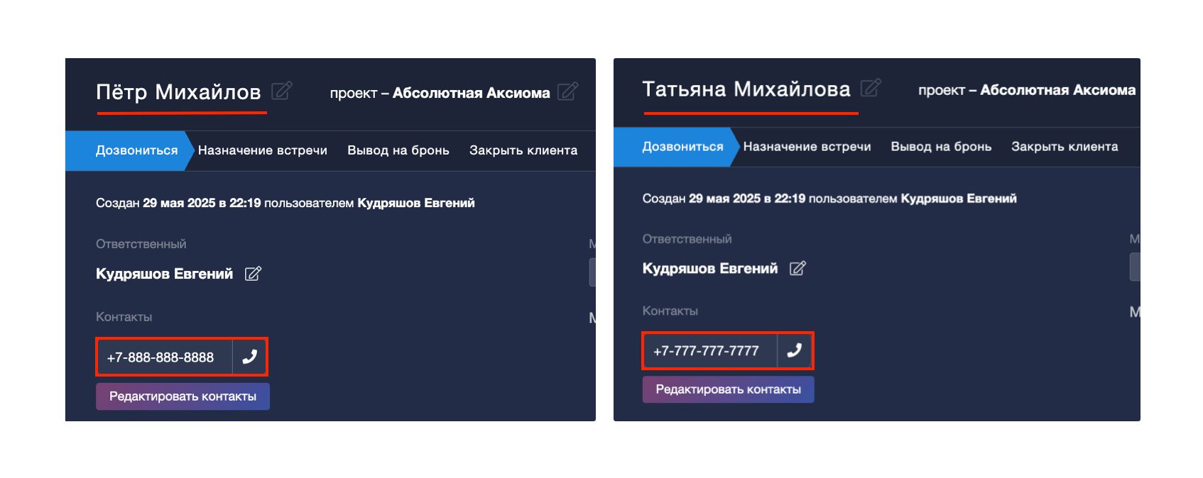 У Петра номер +7-888-888-8888 - его и сделаем ОСНОВНЫМ, а у Татьяны +7-777-777-7777 - этот номер будет добавлен в качестве дополнительного.