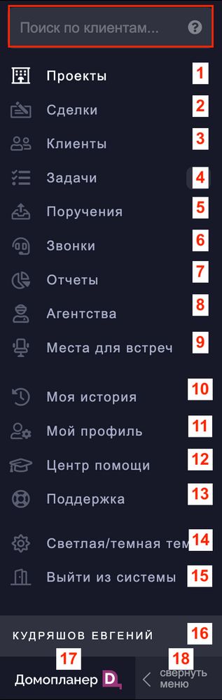 Слева находится меню системы — это место с которого всегда начинается работа и с помощью которого вы можете перемещаться по разделам. Давайте посмотрим из чего оно состоит. Начнем с поиска: