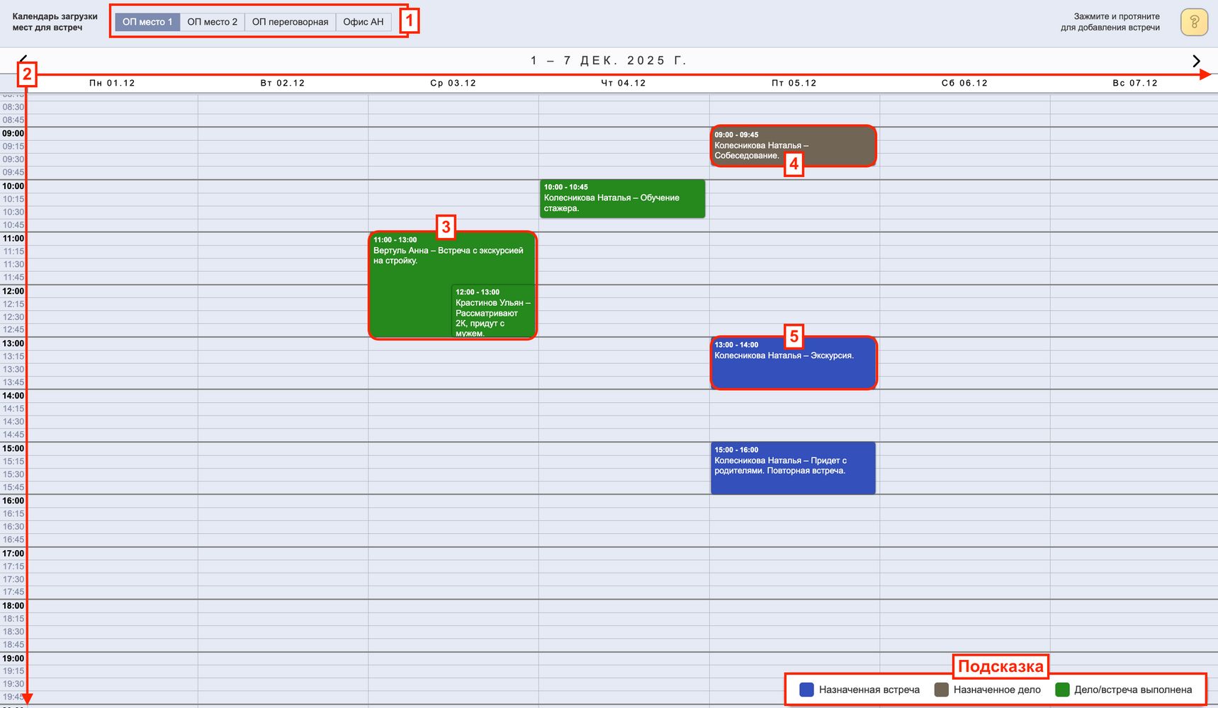 Место для встречи — это то место, где проходит встреча с клиентами. Это может быть как отдельная переговорная, рабочее место менеджера, стройплощадка, так и даже пространство для вебинара, все зависит от настроек именно в вашей компании. Функционал этого раздела позволяет даже в моменте разговора по телефону быстро сориентироваться по наличию свободного места и сразу же забронировать.