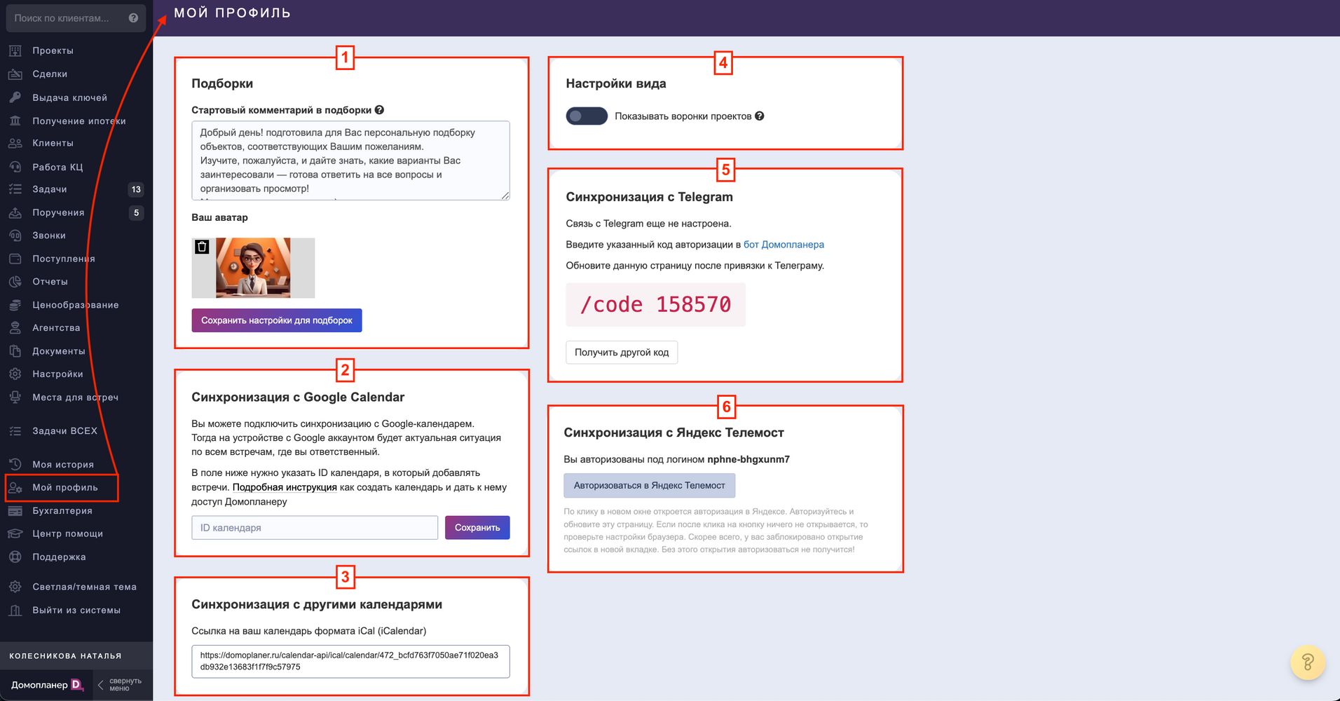 В разделе МОЙ ПРОФИЛЬ нажимаете на кнопку получить код, копируете и затем нажимаете на ссылку "бот Домопланера":