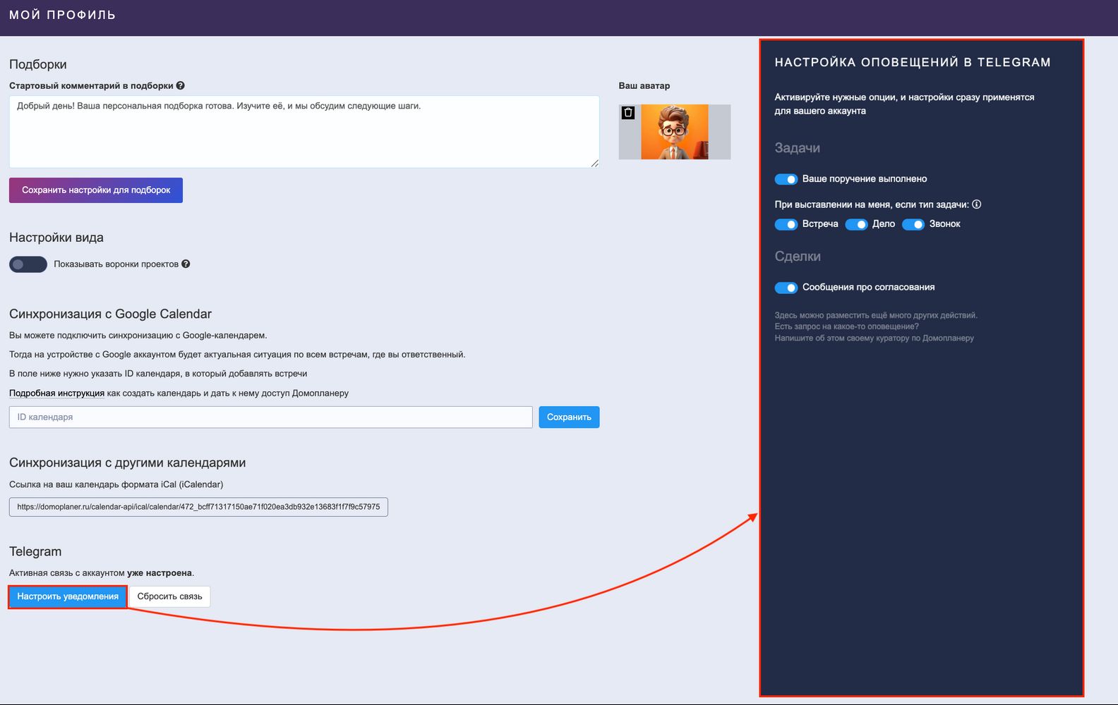 Затем следует вернуться в Домопланер, в раздел МОЙ АККАУНТ, обновить страницу и настроить оповещения: