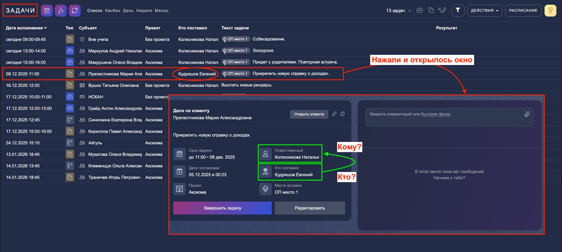 3. ПОРУЧЕНИЯ В РАБОТЕ. Тут расположены поручения, которые еще в процессе исполнения. Активным остается также каждое поручение — нажимаете и попадаете в окно задачи, а также субъекты — клиенты/сделки.