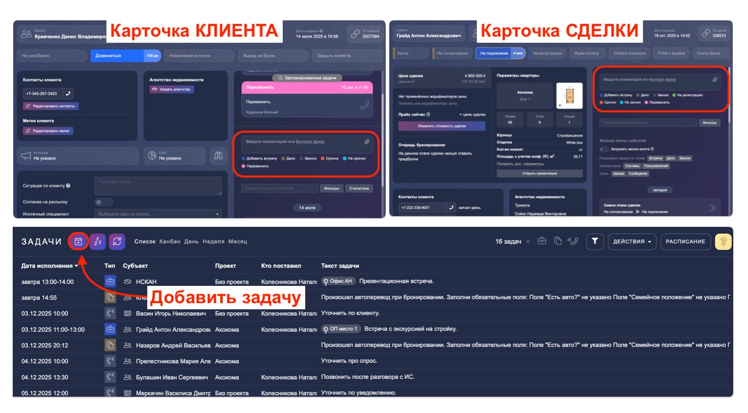 Задачу можно создать, как вы уже знаете, из окна клиента, из окна сделки, и для задач вне учета — в разделе ЗАДАЧИ через кнопку "добавить задачу":
