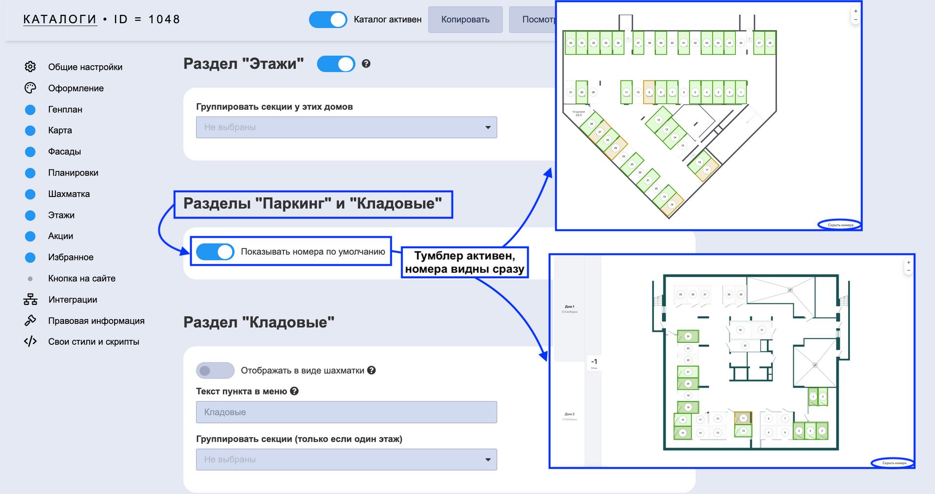 Пройдите в НАСТРОЙКИ — Каталог на сайт — Создать/редактировать каталог — Раздела "Паркинг" и "Кладовые" — и активируйте тумблер "Показывать номера по умолчанию":