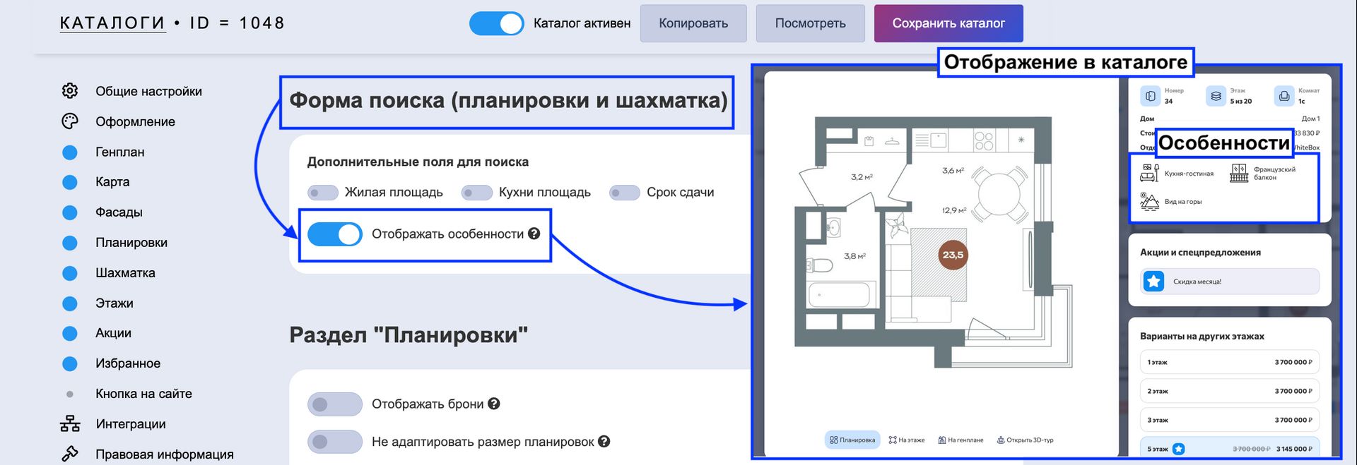 После сохранения настроек в карточке каждой квартиры появится блок с ее характеристиками (например, "вид на парк", "панорамные окна", "свободная планировка"), что повышает информативность и помогает клиенту в выборе.