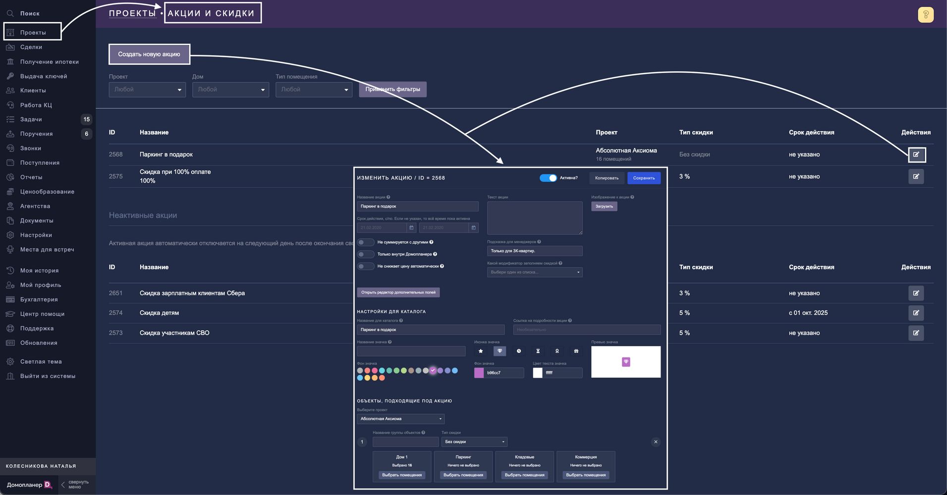 Для этого перейдите в раздел ПРОЕКТЫ — Акции и скидки — создайте новую или отредактируйте существующую: