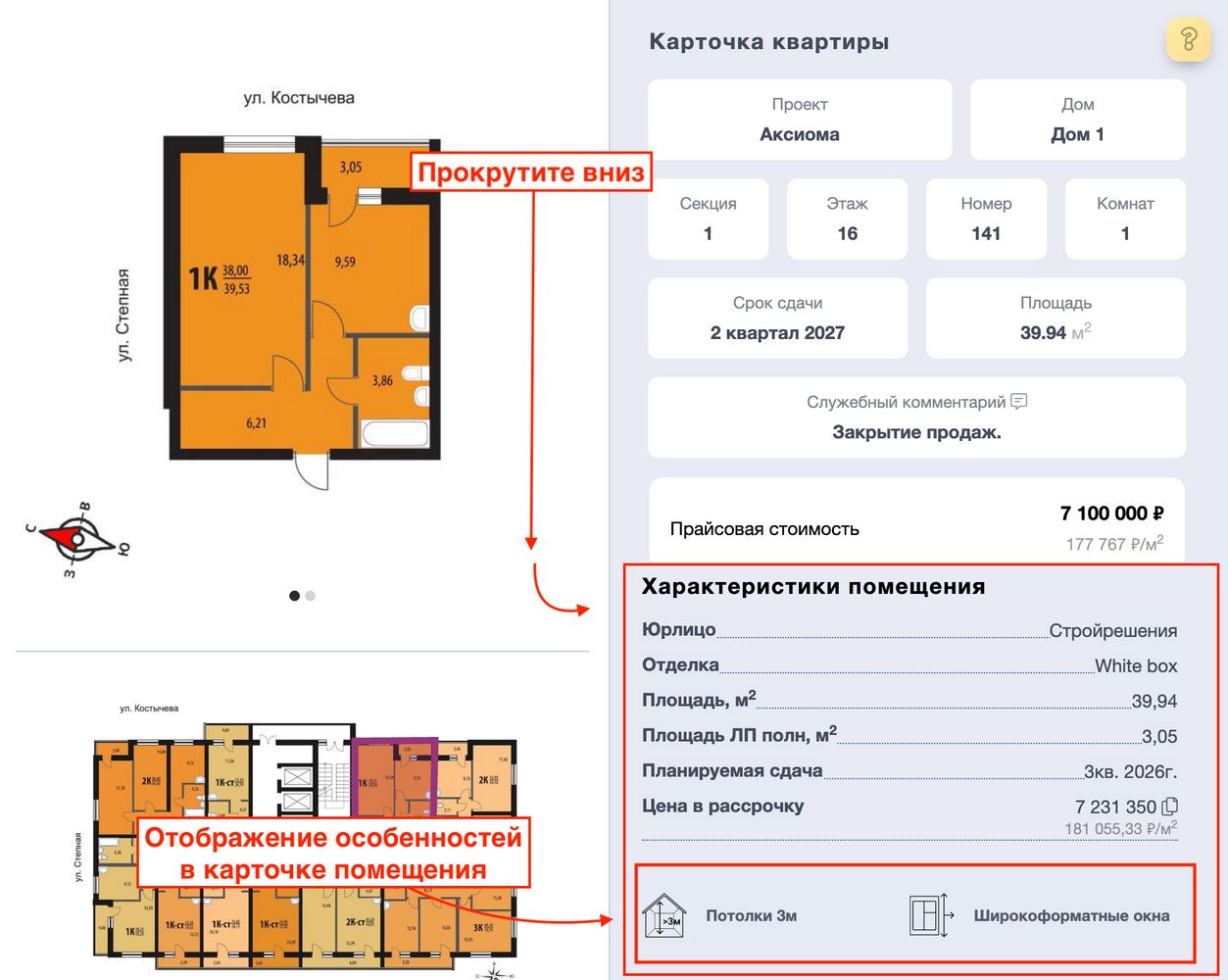 Особенности подключены и отображаются в карточке шахматки, и во внешнем каталоге. Также можно применять фильтр по особенностям, чтобы было проще найти определенные помещения:
