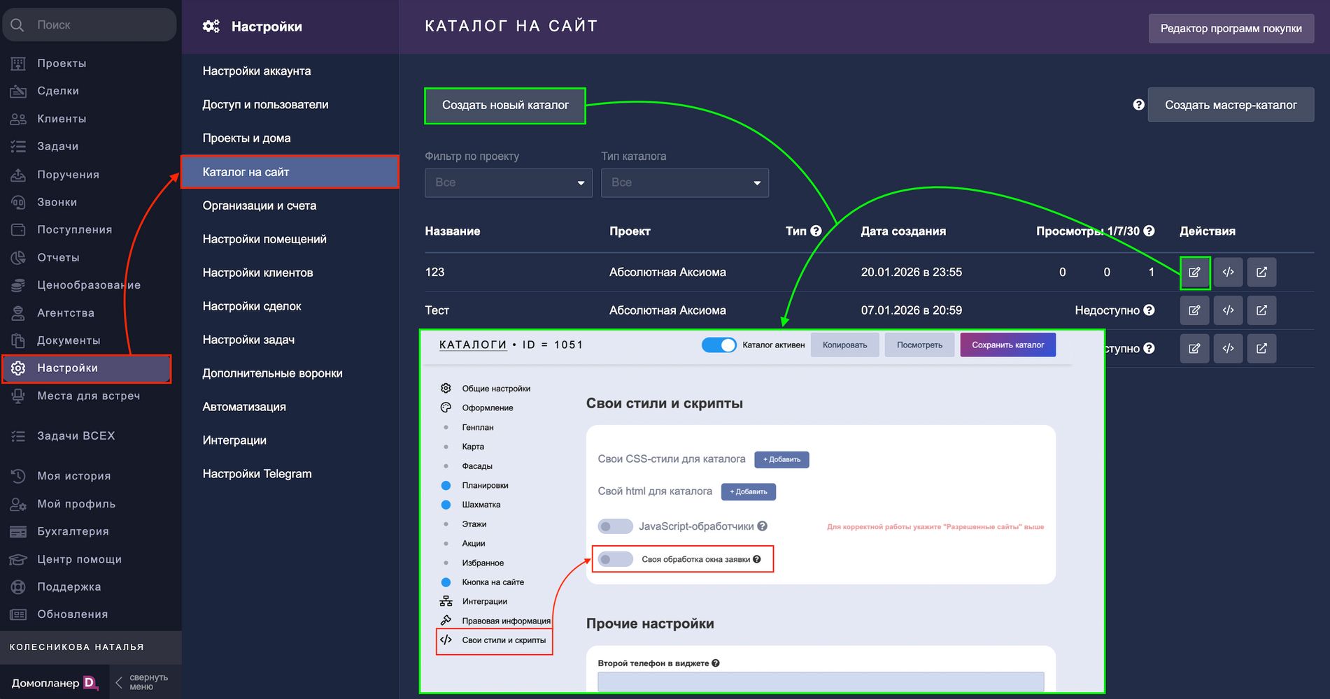 Не забудьте активировать свою обработку заявок в настройках каталога. Для этого пройдите в НАСТРОЙКИ — Каталог на сайт — Создать/редактировать каталог — Свои стили и скрипты — активируйте тумблер "Своя обработка окна заявки":
