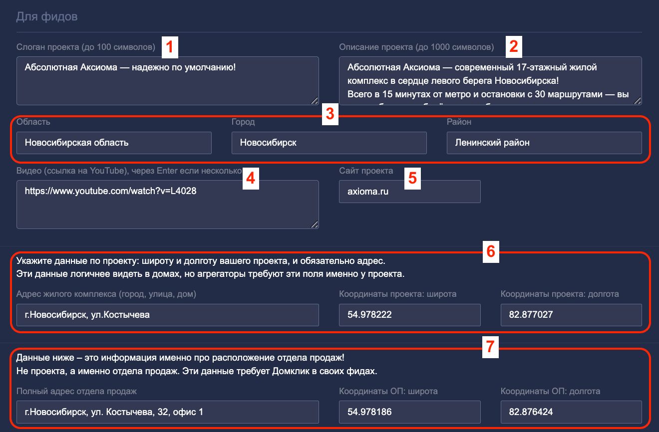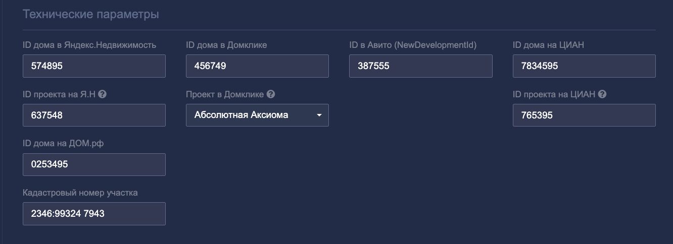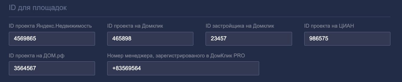Данный раздел необходим для связи между платформой, на которой размещено объявление о продаже, и Домопланером. Здесь указывается ID проекта для каждой рекламной площадки (в первую очередь — для крупных агрегаторов):