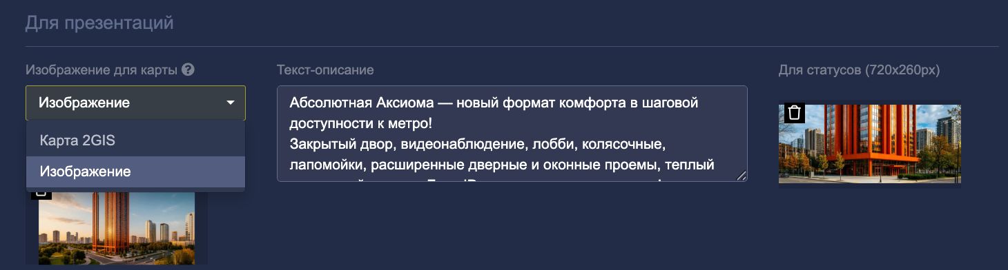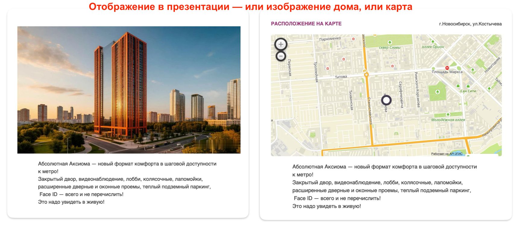 — Изображение для карты. Вы можете выбрать для презентации: изображение проекта ИЛИ местоположение, обозначенное на карте (2Гис), которая загрузится согласно координатам объекта.