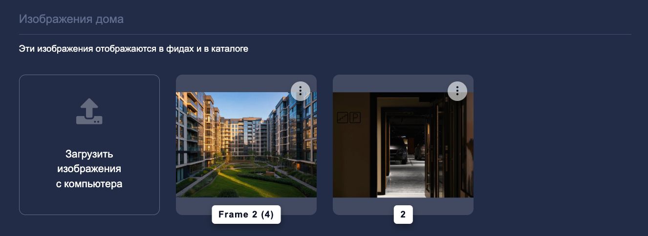 Здесь предусмотрена загрузка изображений дома — они появится в фидах и в каталоге.