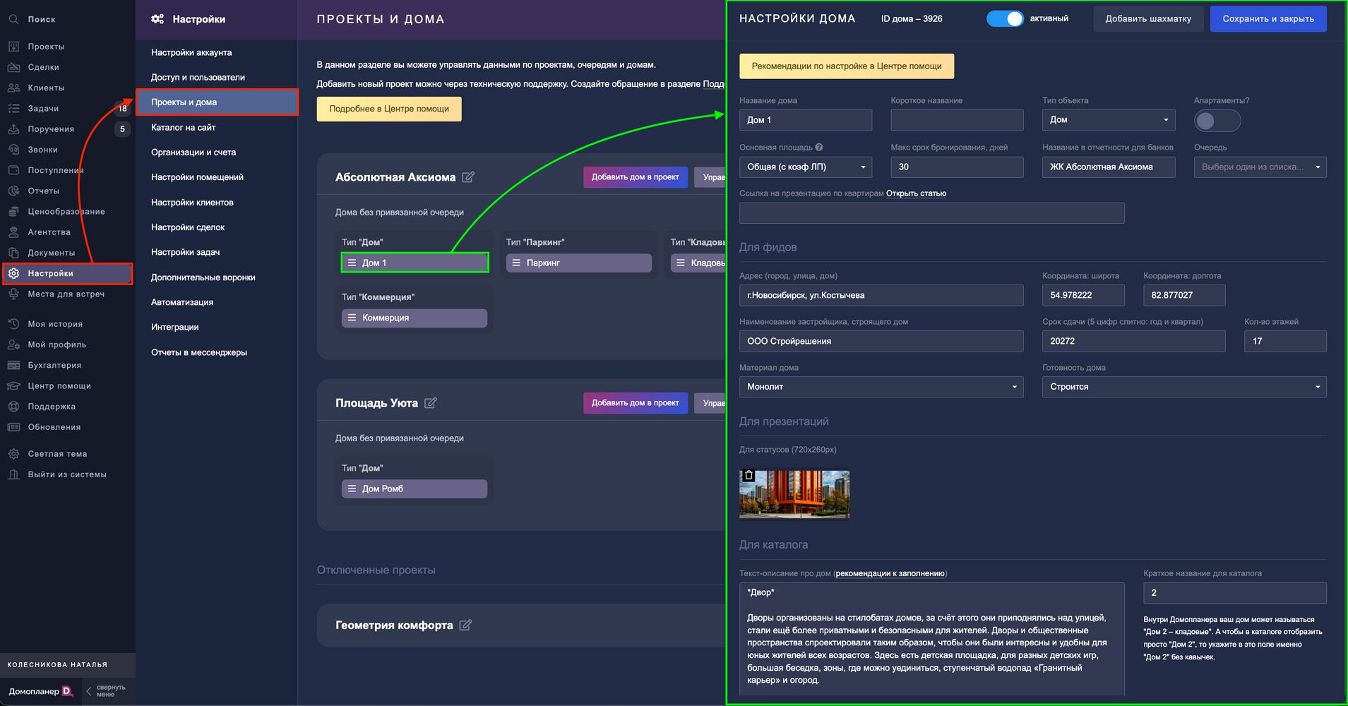 Чтобы настроить проект перейдите в НАСТРОЙКИ — Проекты и дома — нажмите на его название. Откроется окно настроек проекта: