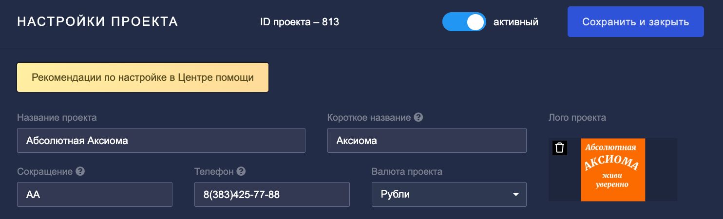 В самом начале вы можете указать название проекта, его укороченную версию или сокращение (используйте аббревиатуру, она будет указана в карточке клиента), разместить логотип, который будет использоваться в проекте, и телефон для приема заявок. Важно указать валюту проекта.