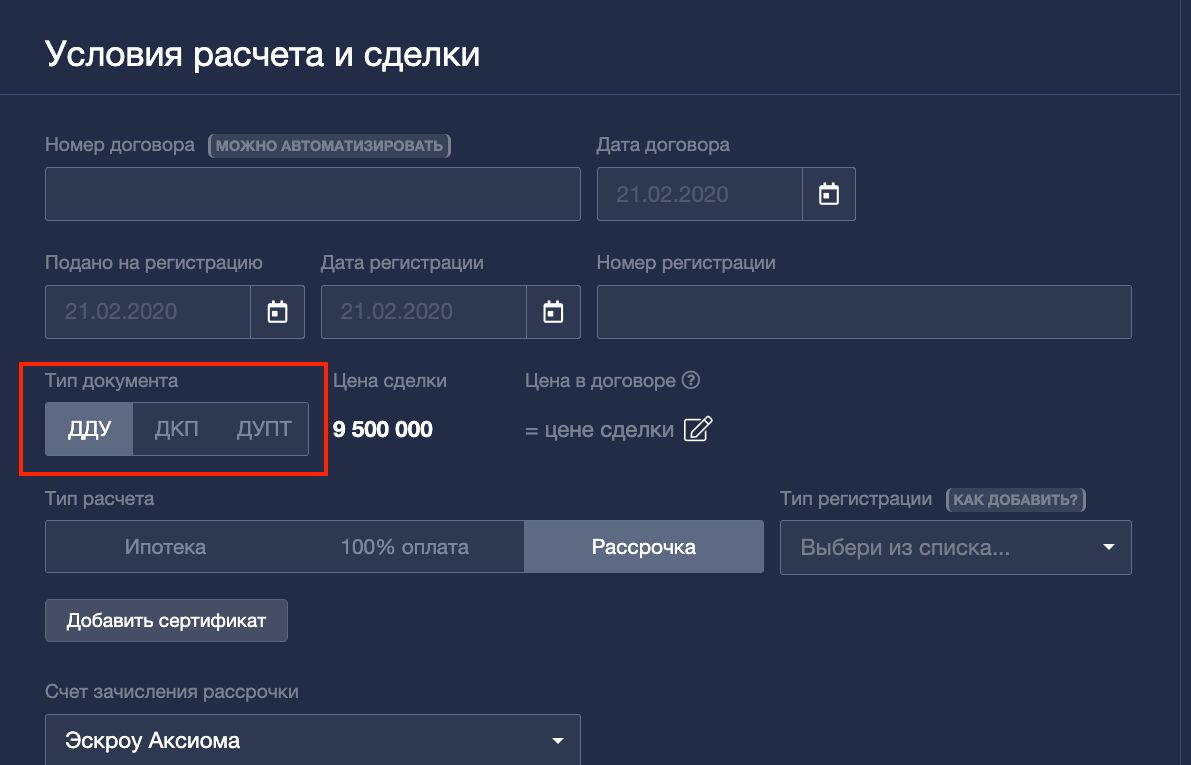 В карточке сделки — блок "Условия расчета и сделки" есть возможность выбрать один из трёх типов оплаты: Ипотека, 100% оплата и Рассрочка. Данная статья посвящена последнему типу оплаты: