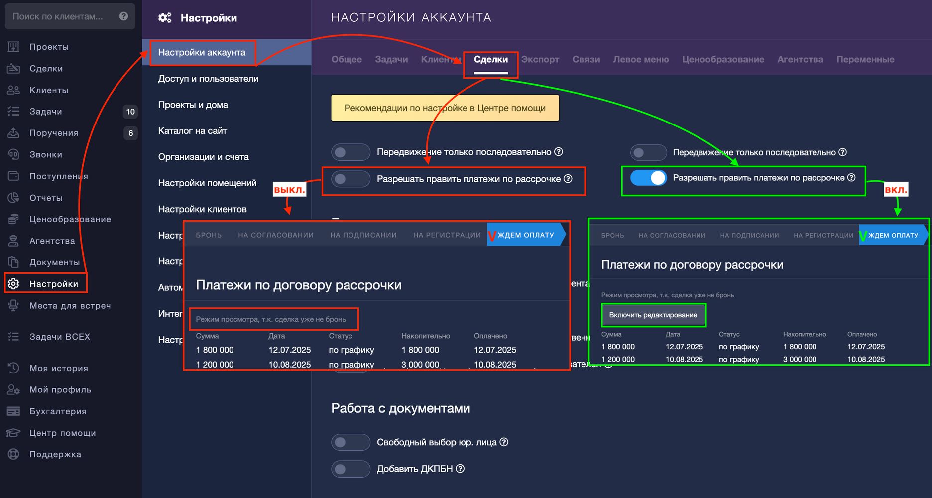 Данный график можно будет редактировать до этапов "Ждем оплату". В дальнейшем для редактирования графика необходимо будет нажимать кнопку "Включить редактирование", если включен тумблер в разделе НАСТРОЙКИ — Настройки аккаунта —Сделки — Разрешить править платежи по рассрочке: