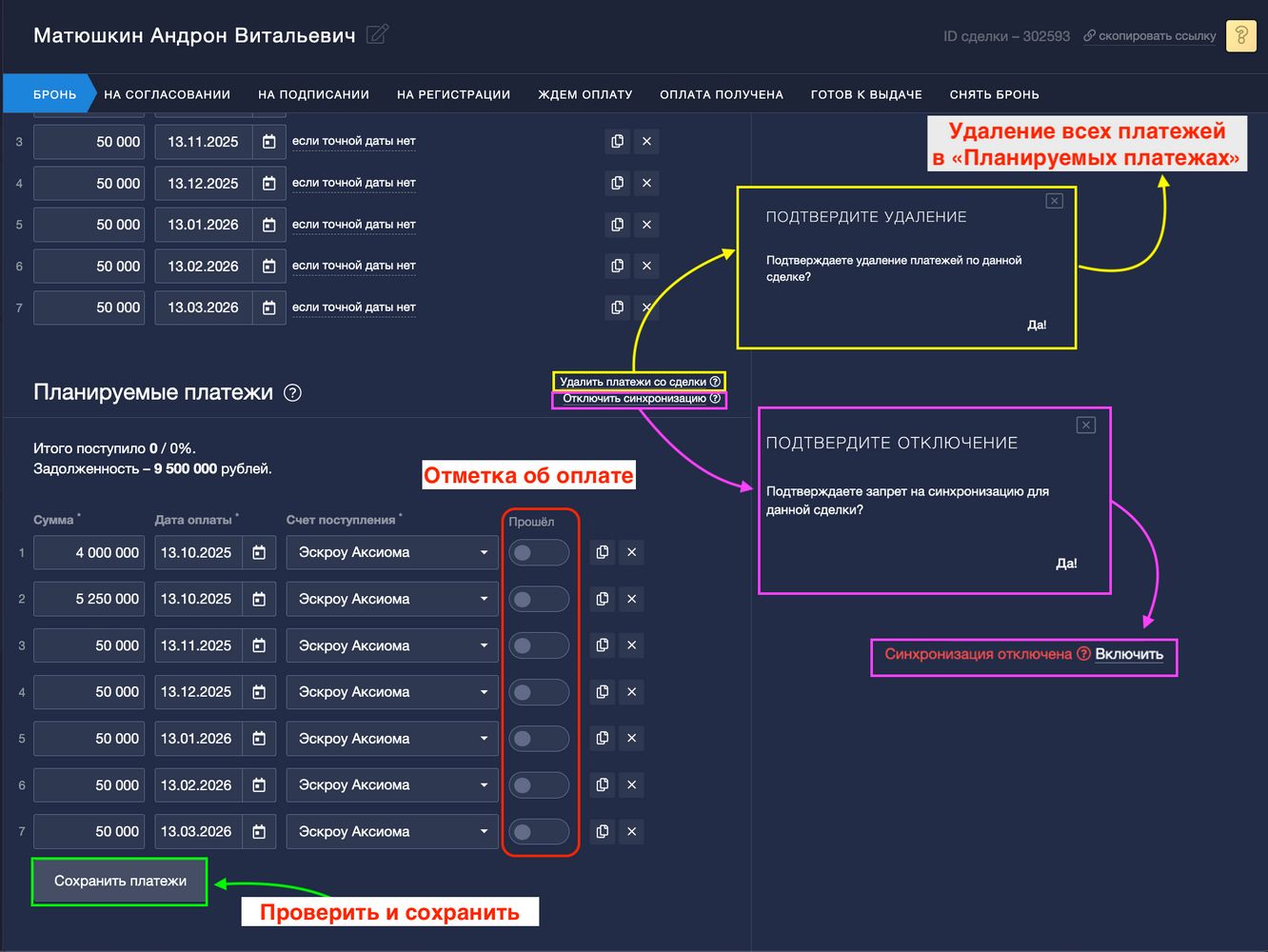 — Удалить платежи со сделки. При нажатии на эту кнопку полностью обнуляются все внесенные платежи.