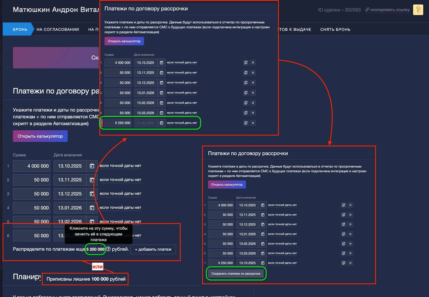 При корректном заполнении графика платежей, под последним платежом появится кнопка "Сохранить платежи по рассрочке", который зафиксирует график.