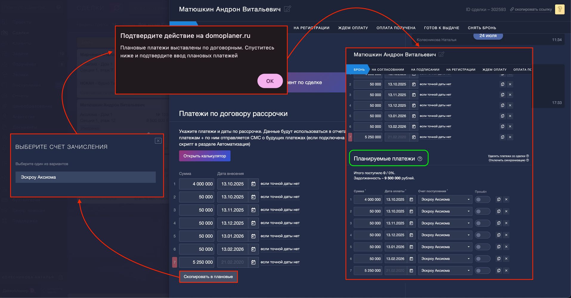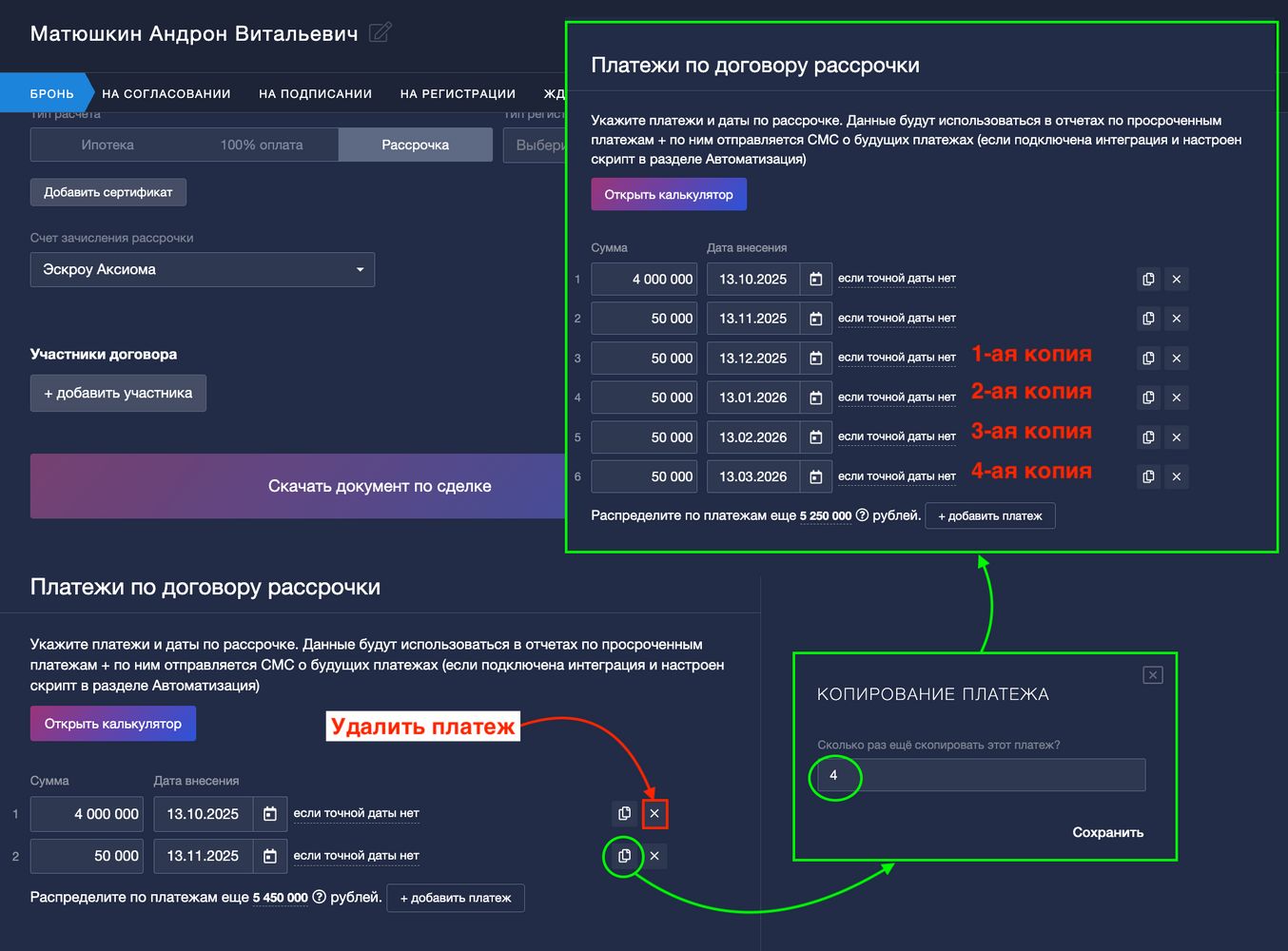 После появления платежей в "Планируемых платежах" их нужно проверить и сохранить. Этот график платежей возможно изменять на любом этапе сделки — редактировать, копировать, удалять.
