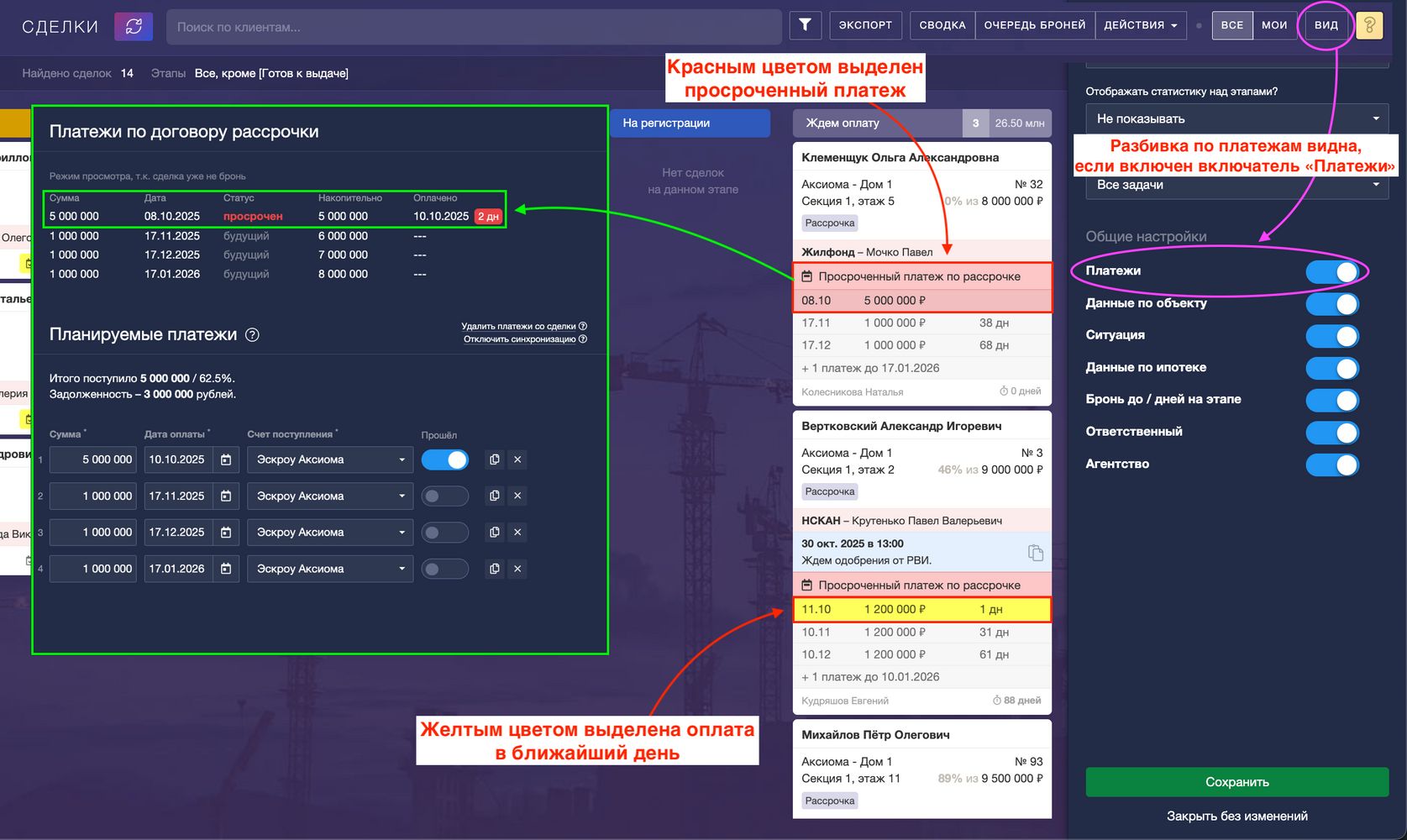 — в карточке сделки соответствующее уведомление с указанием количества дней, на которые был просрочен платеж по сравнению с датой из графика платежей.