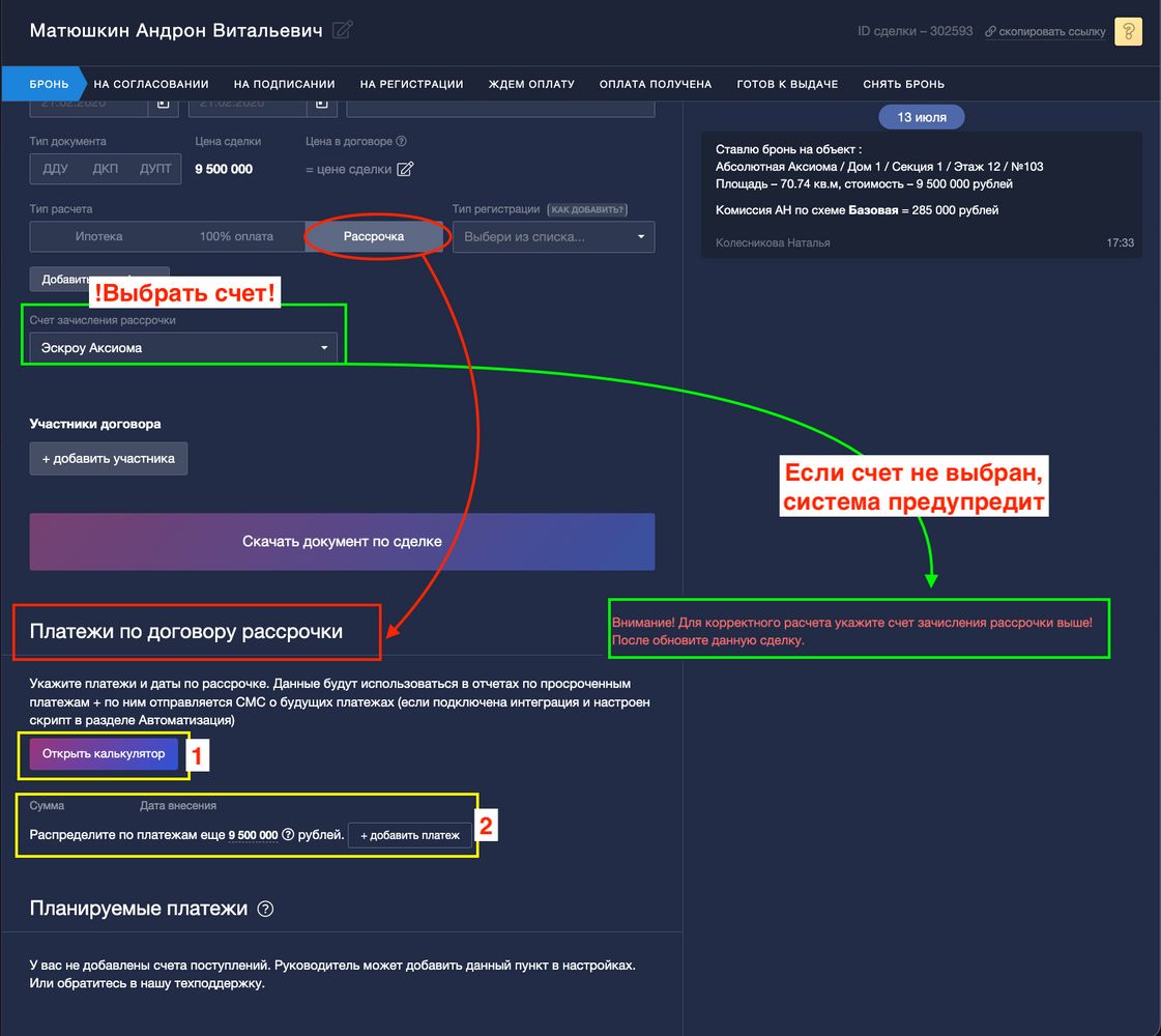 ВАЖНО сразу же выбрать "Счет зачисления рассрочки", если Вы забудете, то Домопланер напомнит вам сообщением красного цвета: