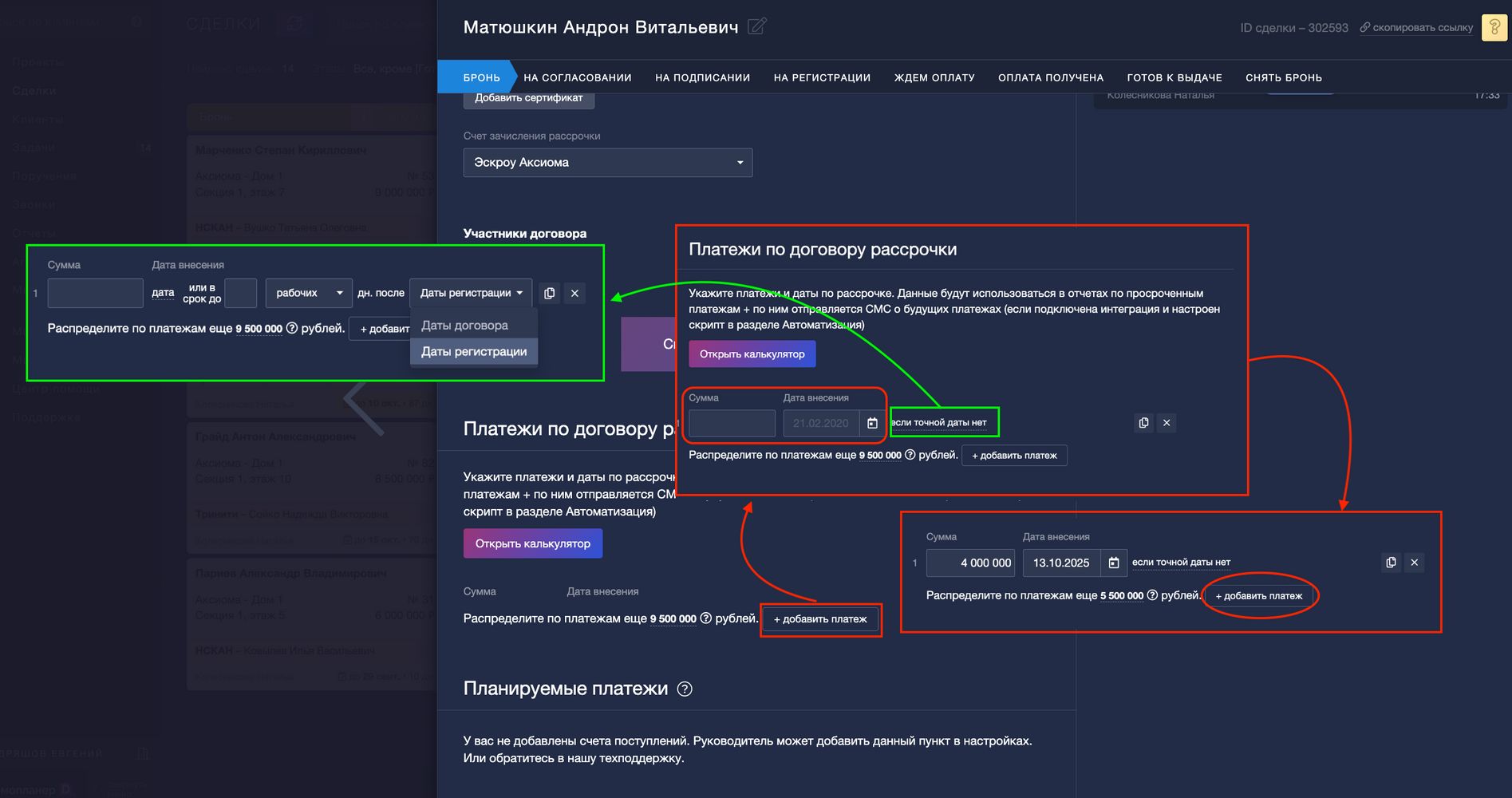 Платежи указанные в "Платежи по договору рассрочки" будут указываться только в договоре, а для того чтобы они еще учитывались в отчетах и в разделе ПОСТУПЛЕНИЯ, а также синхронизировались с 1С и эскроу, их нужно перенести в "Планируемые платежи".