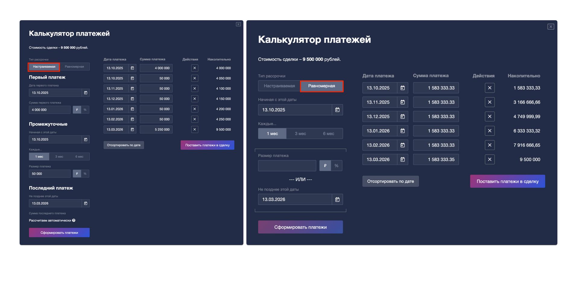 При этом способе вам достаточно выбрать тип рассрочки, указать вводные — система самостоятельно рассчитает платежи/даты и предложит график платежей: