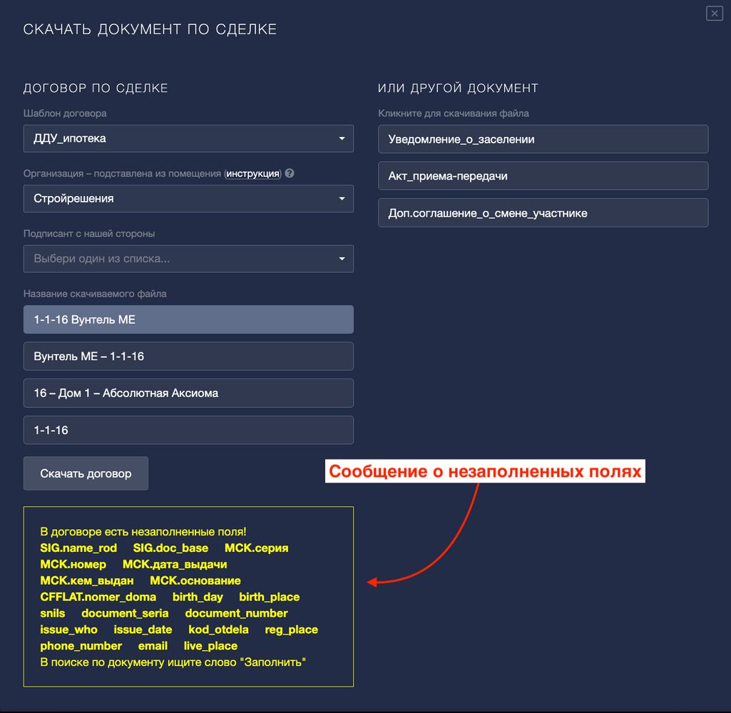 Если при скачивании документа системе не хватает данных для некоторых переменных, Домопланер укажет на эту проблему и перечислит, какая именно информация отсутствует: