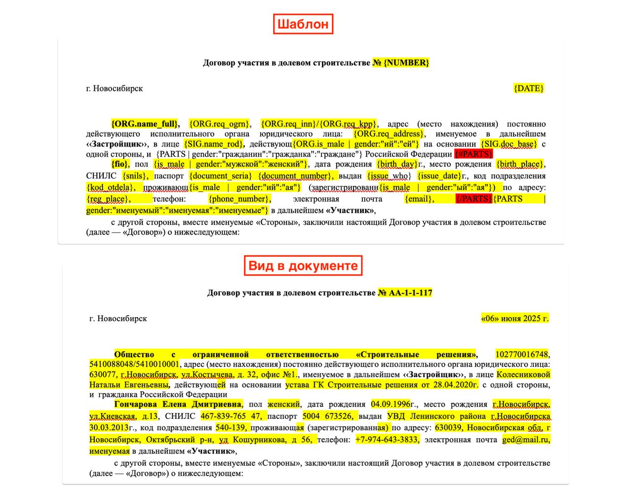 Такой подход помогает быстро проверять и шаблон, и готовые документы. Цветное выделение сразу показывает места для контроля, экономя ваше время.