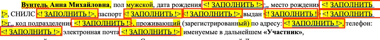 Вы всё равно сможете скачать документ. В нем все незаполненные поля будут выделены хорошо заметной меткой — надписью <! ЗАПОЛНИТЬ !> :