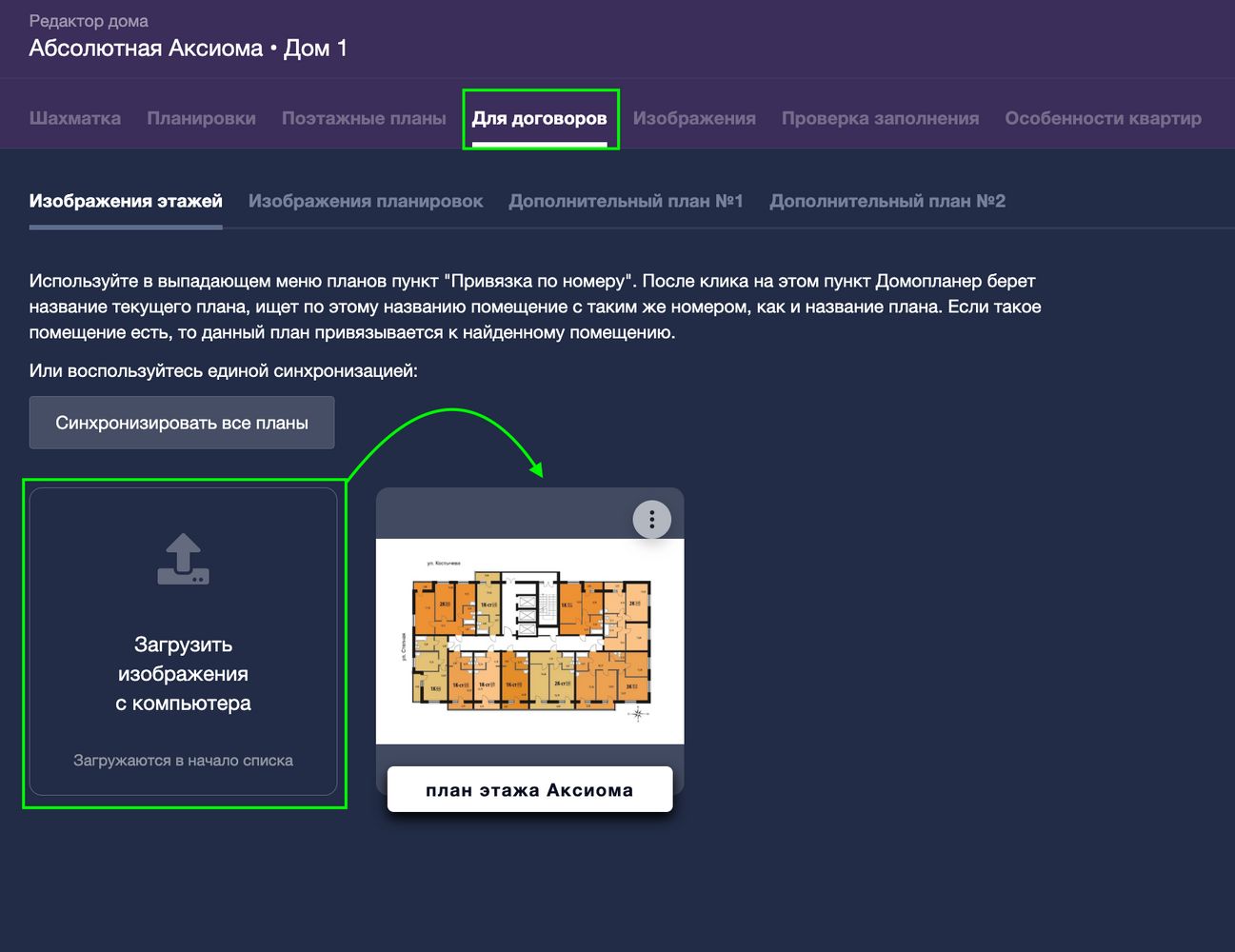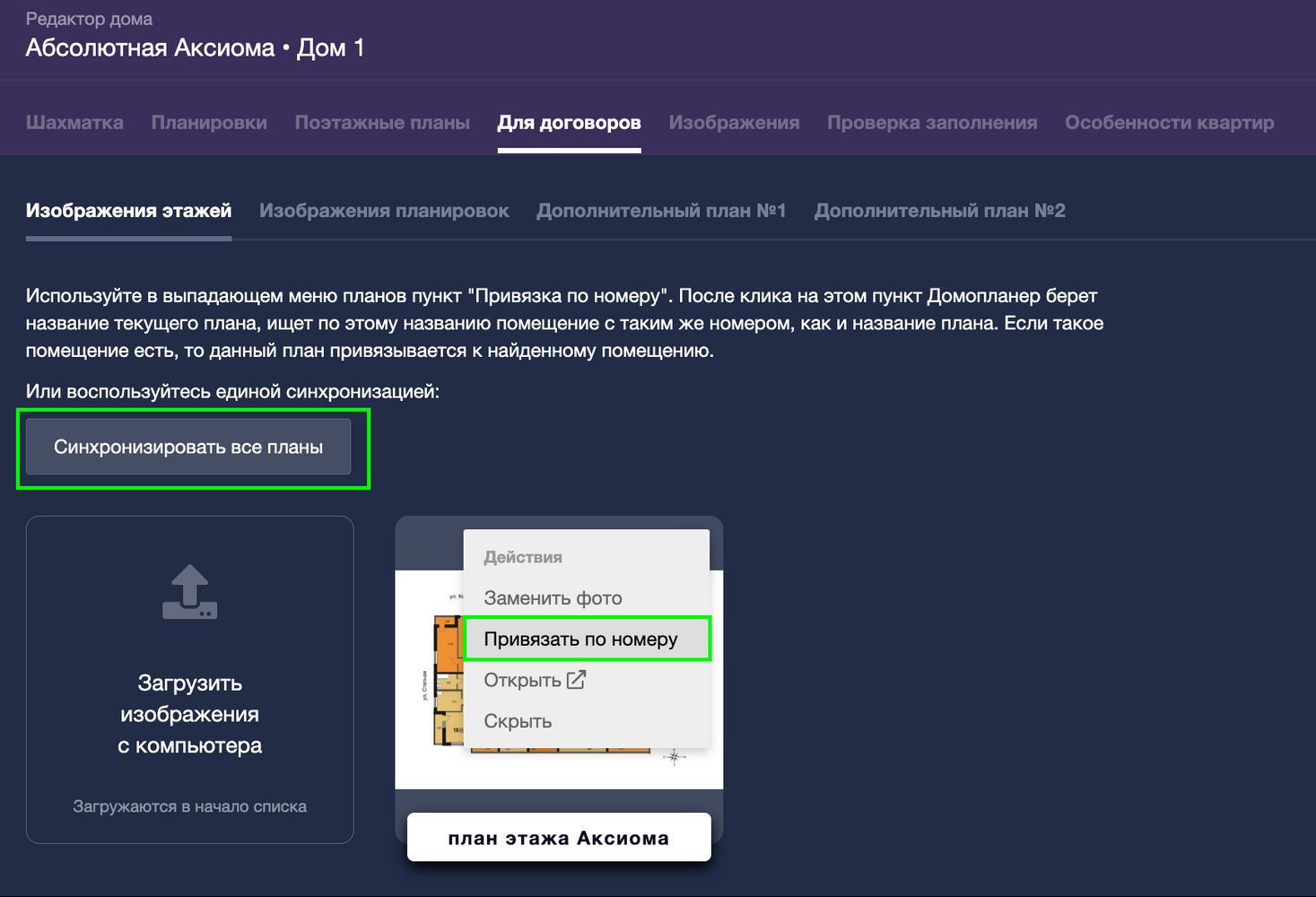 Это тоже способ привязки плана/планировки/доп.изображения к помещению, но в индивидуальном порядке. То есть для каждого помещения должен быть свой план/планировка/доп.изображение, названный тем же номером, что и помещение — например, если помещений 50, то и планов/планировок/доп.изображений должно быть 50. Процесс достаточно прост: просто загрузите и нажмите на кнопку "Синхронизировать" или на пункт "Привязать по номеру".