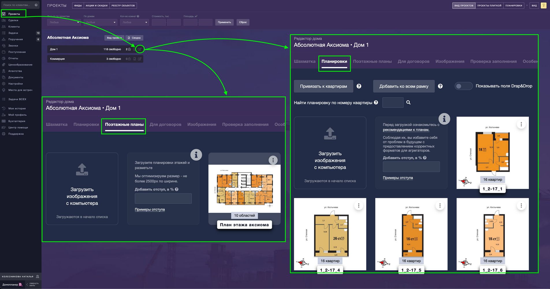 Давайте рассмотрим подробнее как загрузить или исправить информацию в этом разделе. Пройдите в ПРОЕКТЫ — Редактор дома — подраздел "Для договоров" — Загрузить изображения с компьютера. Загрузите сюда все поэтажные планы, которые будут отображаться в договоре:
