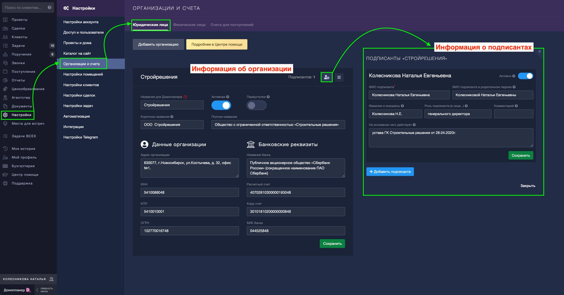 Все данные со стороны застройщика Домопланер автоматически подгружает из раздела «Организации и счета»: