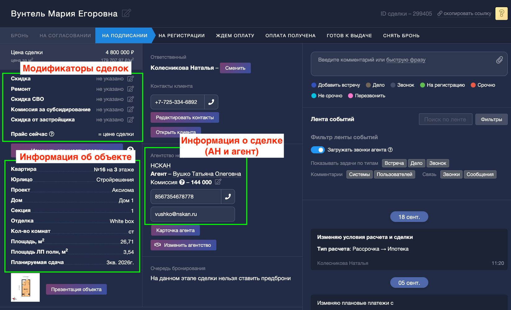 Информацию о модификаторах, объекте, АН и агентстве вы можете проверить в самом начале карточки: