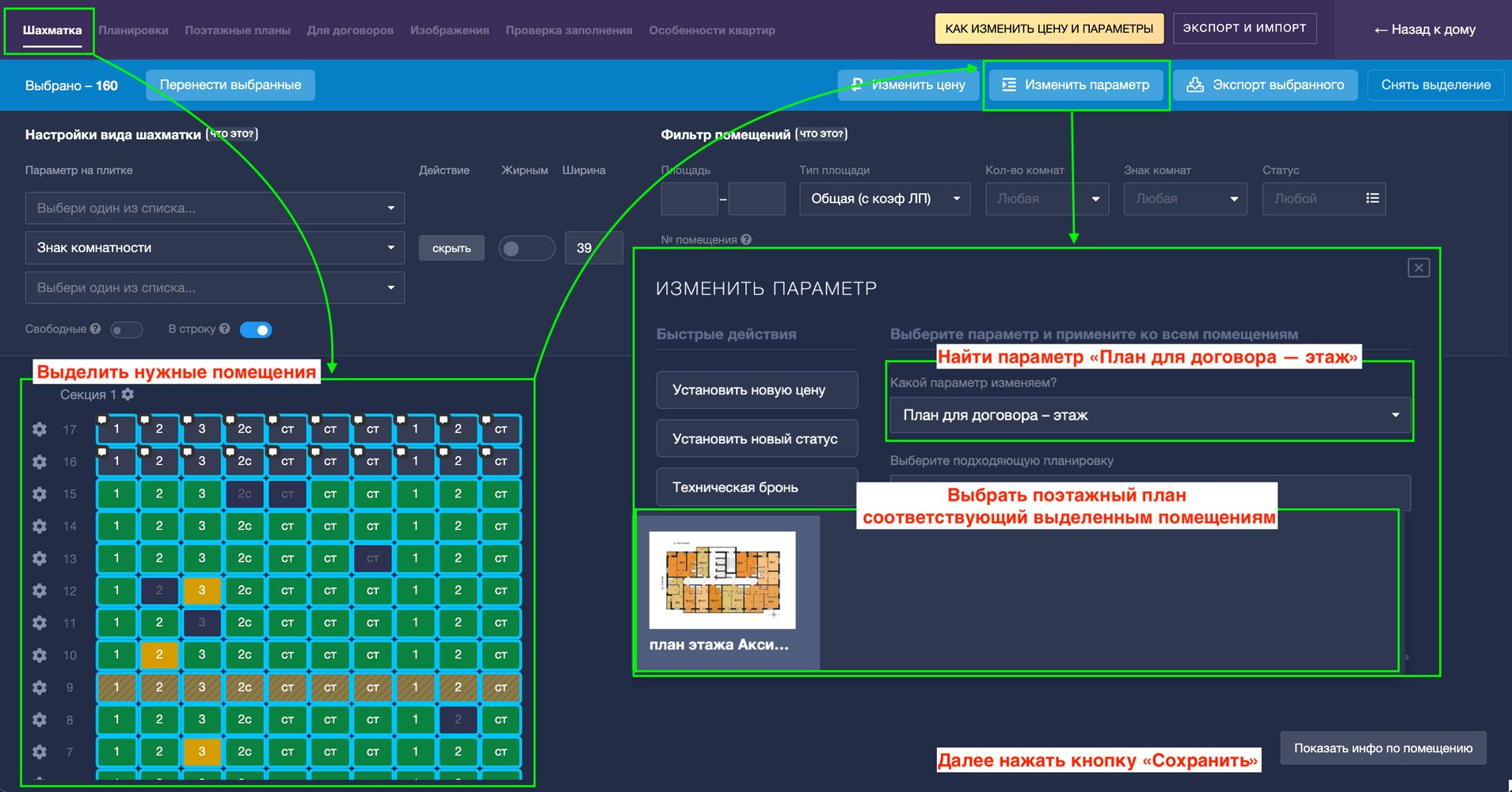 Теперь нужно привязать поэтажные планы к квартирам. Для этого перейдите во вкладку "Шахматка", выделите нужные помещения, выберите "Изменить параметр", найдите параметр "План для договора — этаж" и соответствующий план этажа.