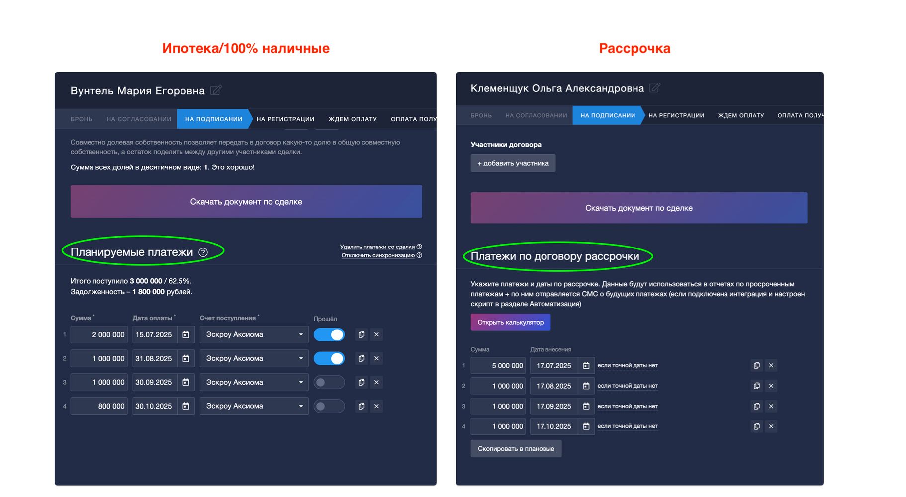 Информацию о планируемых платежах (для ипотеки) и графике платежей при рассрочке система подставит из соответствующих блоков в карточке сделки: