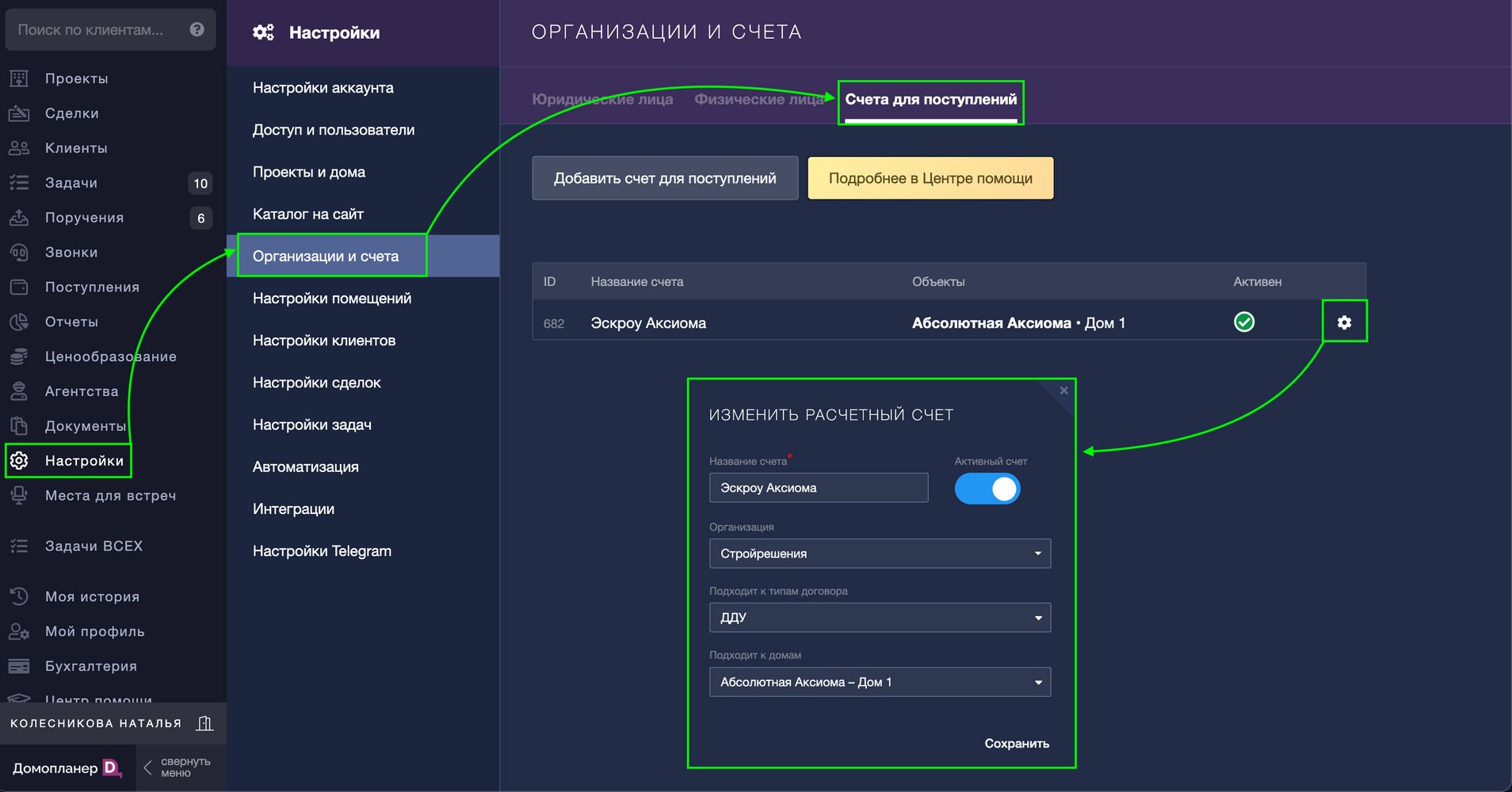 В этом же разделе во вкладке "Счета для поступлений" необходимо обозначить все возможные счета. При создании счета у вас будет возможность выбрать для каких типов договоров/домов он подходит: