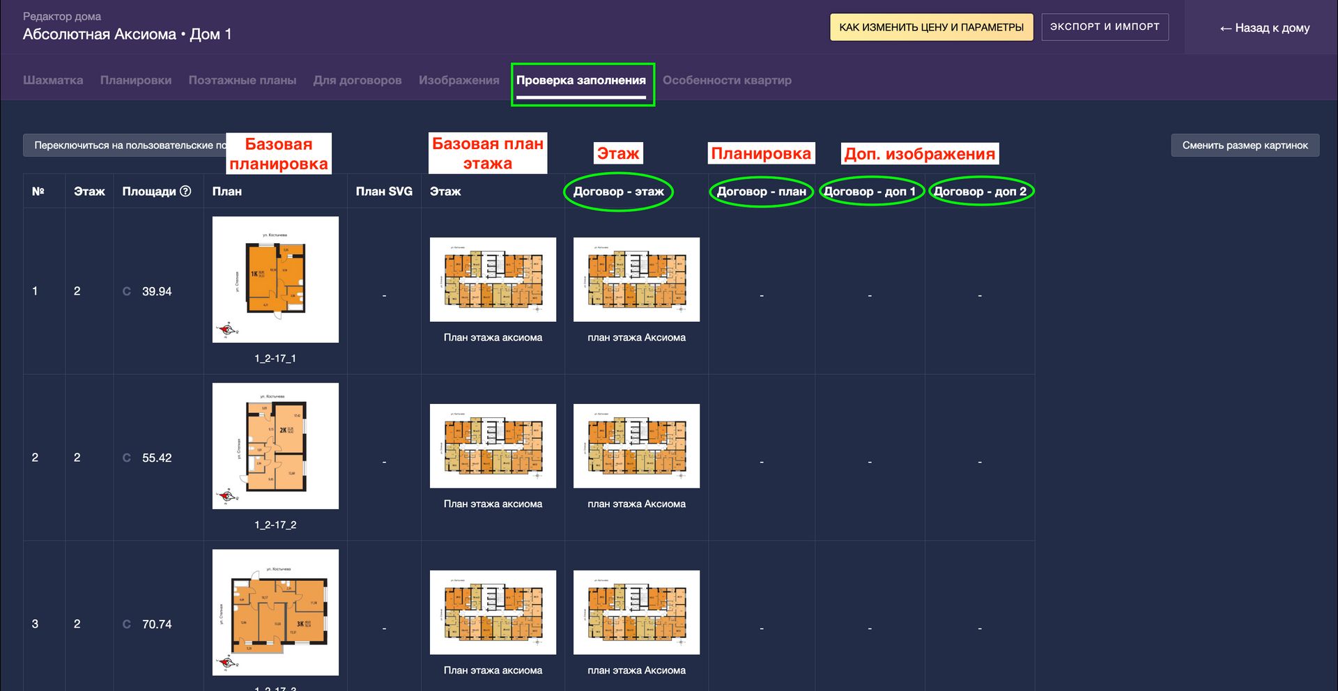 Для этих переменных система укажет в договоре базовые планировку и план этажа, загруженные в шахматке. Проверить и изменить их вы можете в разделе ПРОЕКТЫ — Редактор дома — Планировки/Поэтажные планы: