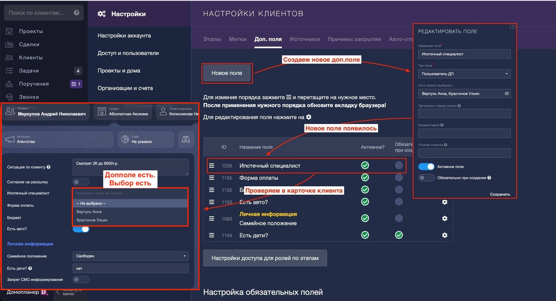 Решение: Создадим новое поле "Ипотечный специалист", в типе поля выберем "Пользователь ДП" и укажем всех ипотечных специалистов. В "Настройках доступа для ролей по этап" оставим полный доступ для всех. В "Настройках обязательных полей" не будем отмечать как обязательное, ведь есть сделки и без ипотеки. Обновим страницу и идем в раздел КЛИЕНТЫ — карточка клиента (любого) — проверяем, что поле появилось с выбором ипотечного специалиста: