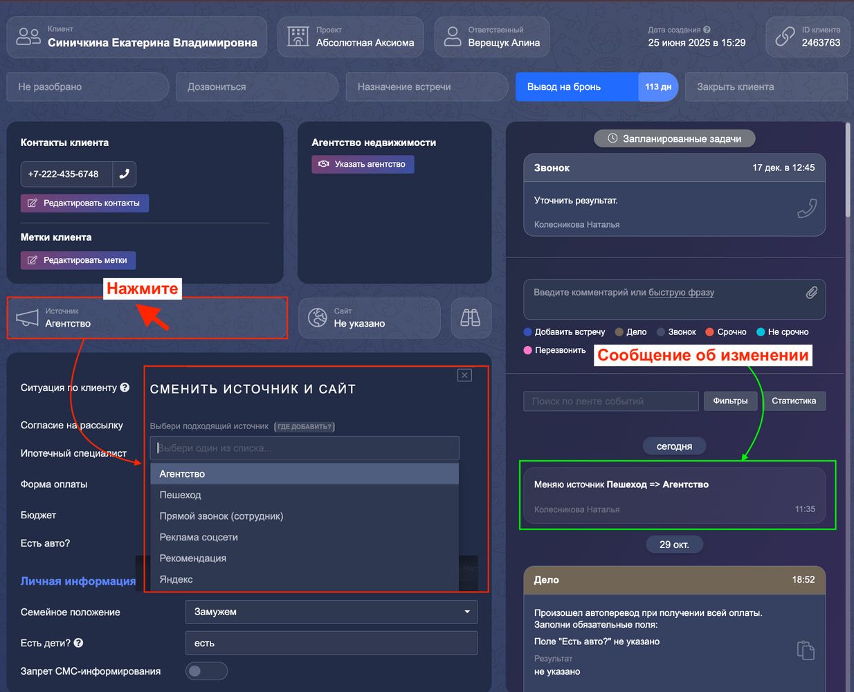 И затем они отражаются в карточке клиента. Сотрудник с правом изменять источники — обычно это руководящий состав, может поменять источник впоследствии. Но в карточке останется информация об изменении. После изменения в фильтрации и отчетах участвует новый источник.