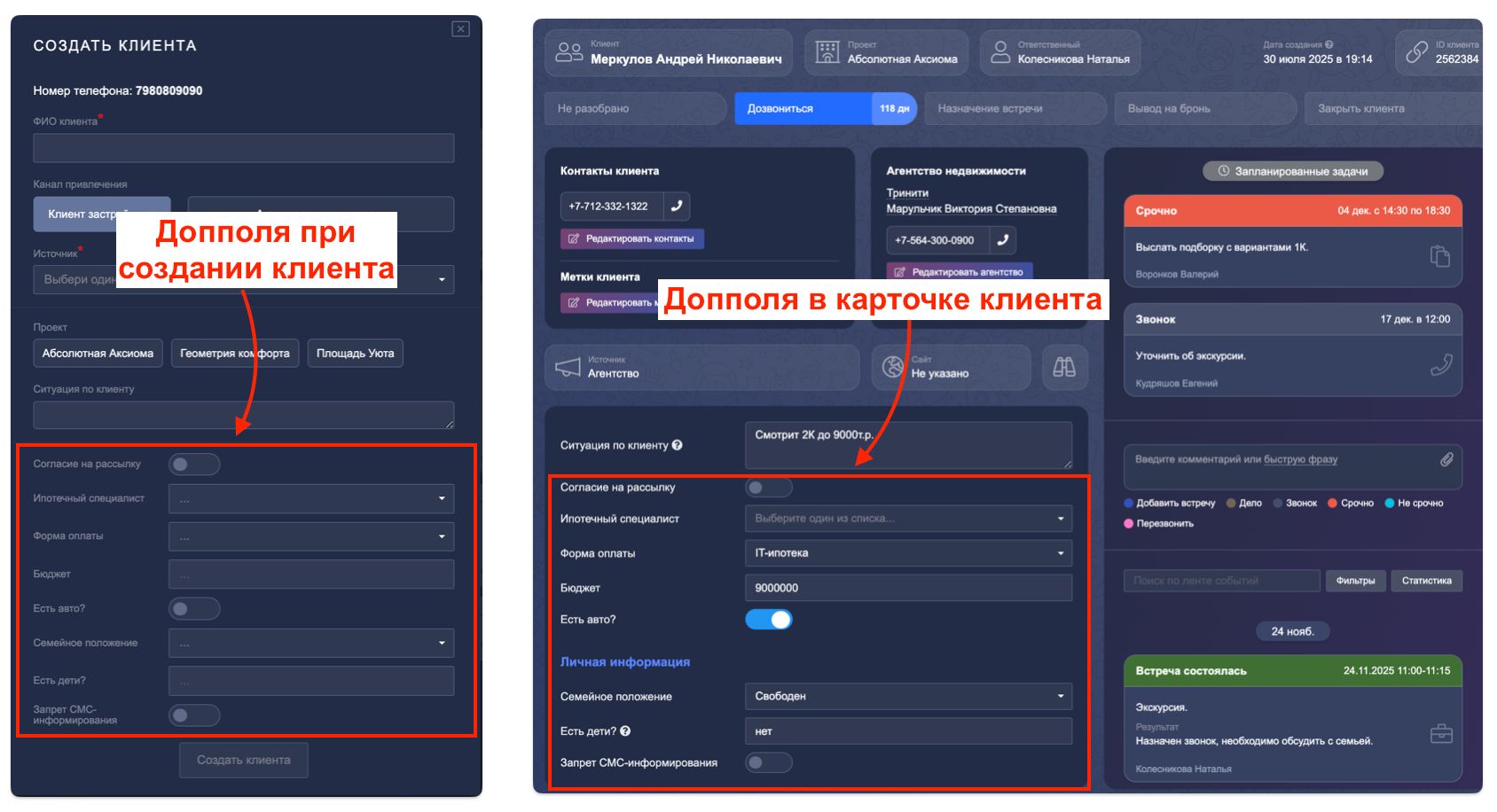 Отображаются доп.поля в форме при создании клиента ручным методом и в карточке клиента: